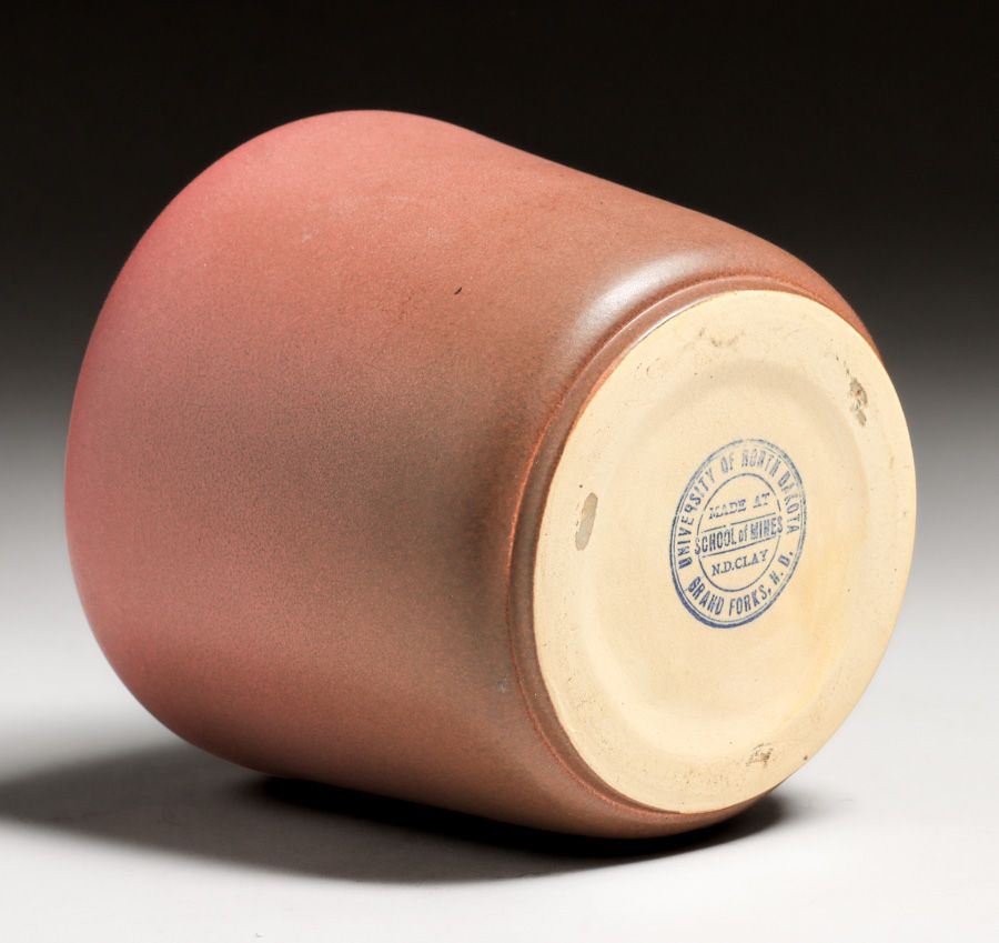 North Dakota School of Mines Covered Humidor c1920s. Signed. Invisible professional restoration to interior flecks, otherwise perfect condition. 6.75"h x 5.5"d SOLD