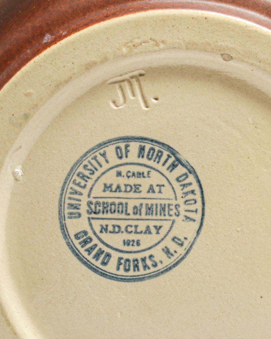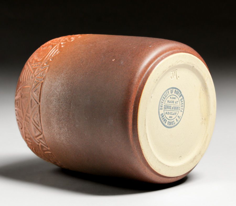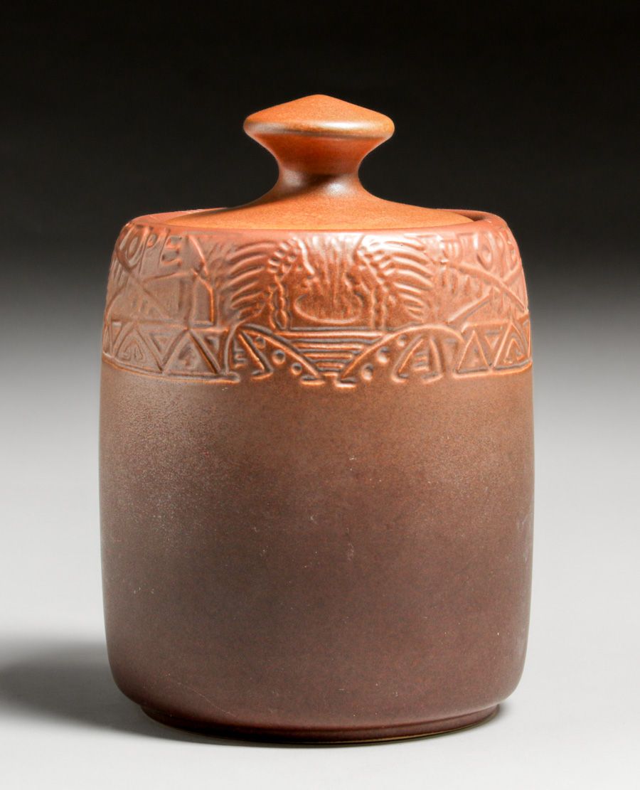North Dakota School of Mines Julia Mattson Hand-Carved Native American Humidor after 1913. Exquisite example of NDSM Pottery with crisp definition. Signed. Perfect condition. 8.25"h x 5.5"d SOLD
