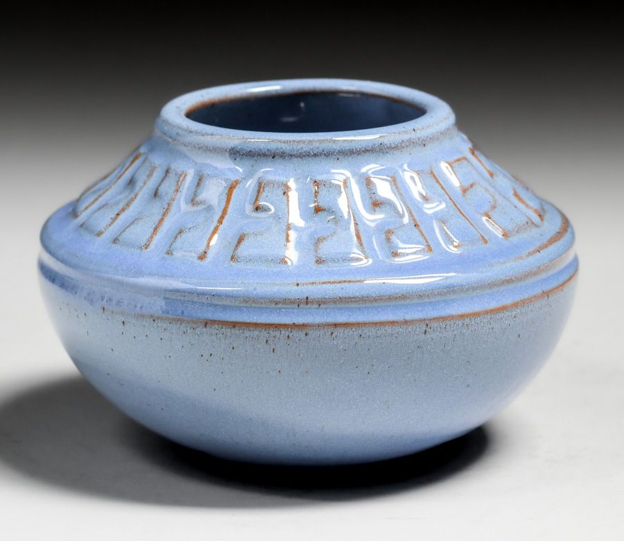 North Dakota School of Mines Julia Mattson Hand-Carved Vase c1920s. Signed. Perfect condition. 3″h x 4.25″d SOLD