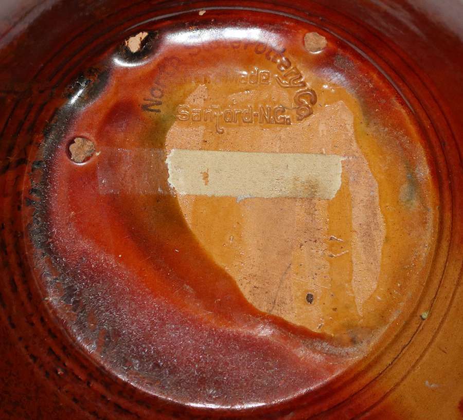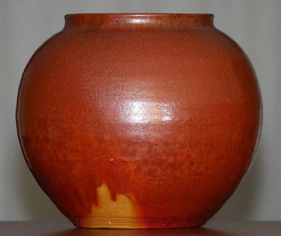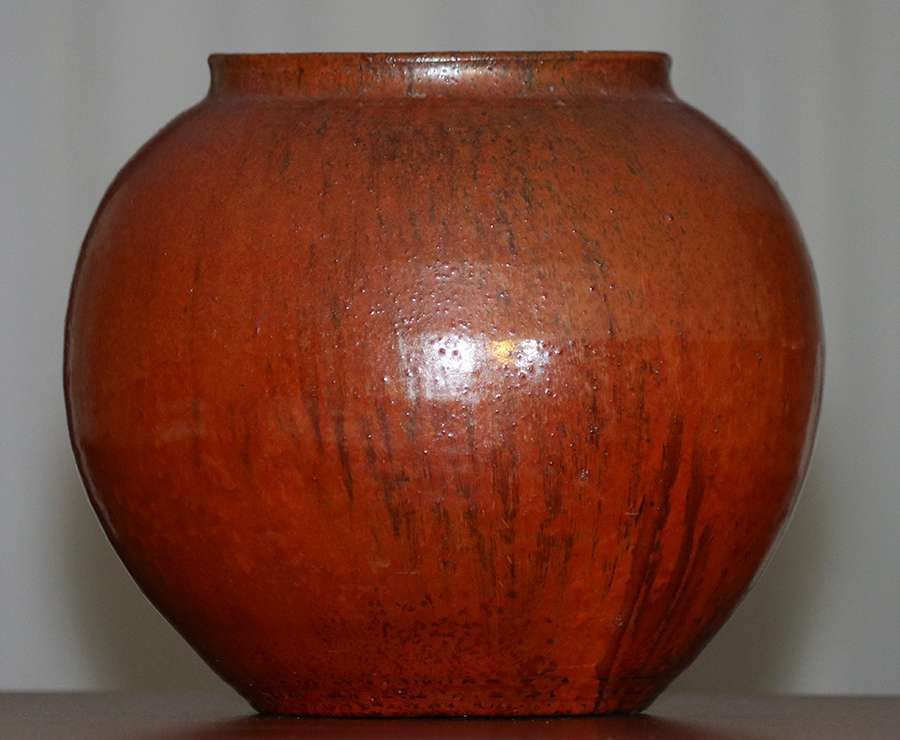 North State Pottery Co - Sanford, NC bulbous vase with Chrome Reddish Orange glaze c1930. Signed. Small base flake, otherwise perfect condition. 8.5"d x 7"h SOLD