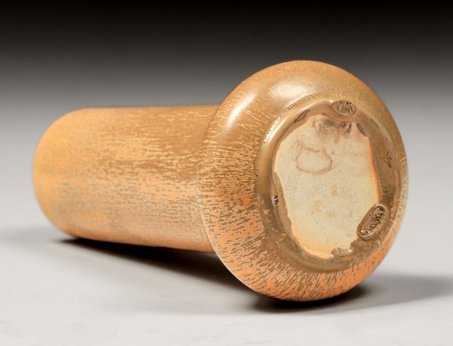 Norweta – Chicago Micro-Crystalline Vase after 1906. Norweta (Northwestern Terra Cotta Co) was founded in 1886 but did not start making art pottery until 1906 upon hiring two of Teco designers, Fritz Albert and Fernand Moreau. They ceased production about 1920. Unsigned. Perfect condition. 7.25″h x 3.75″d SOLD