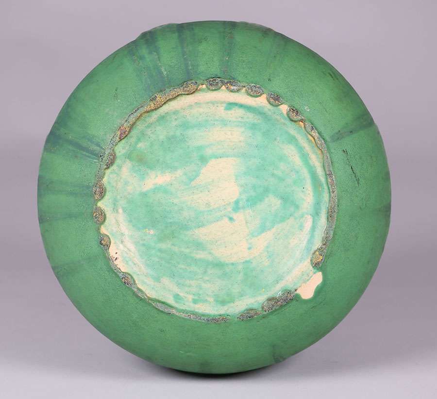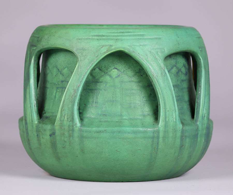 Massive Owens Pottery jardiniere with six reticulated in-body handles. Signed. Two very small edge chips on handles, otherwise perfect condition. 12"W x 10"H SOLD