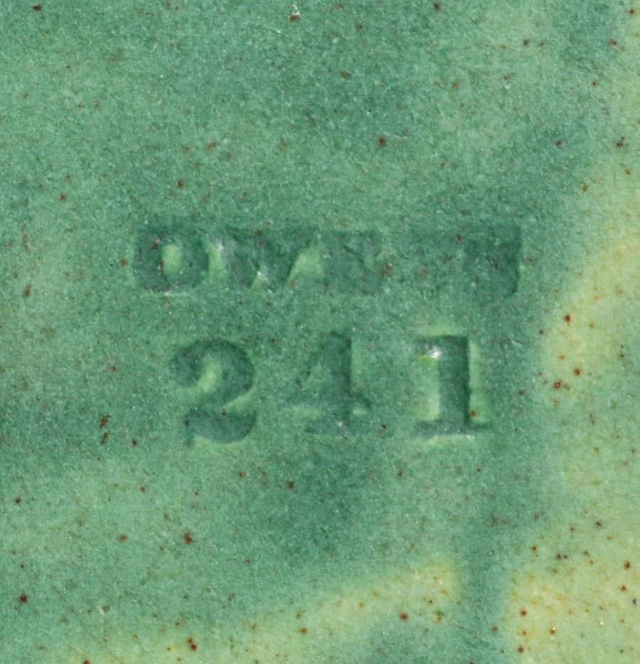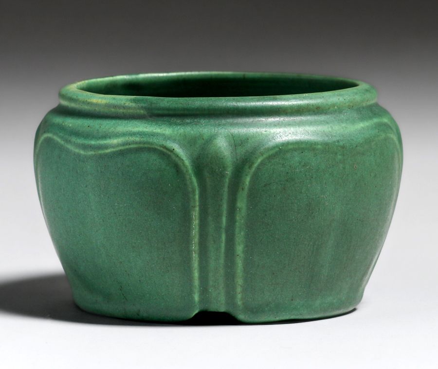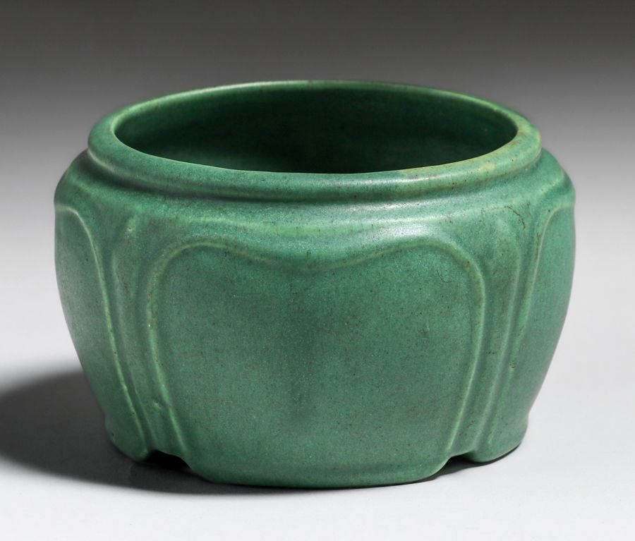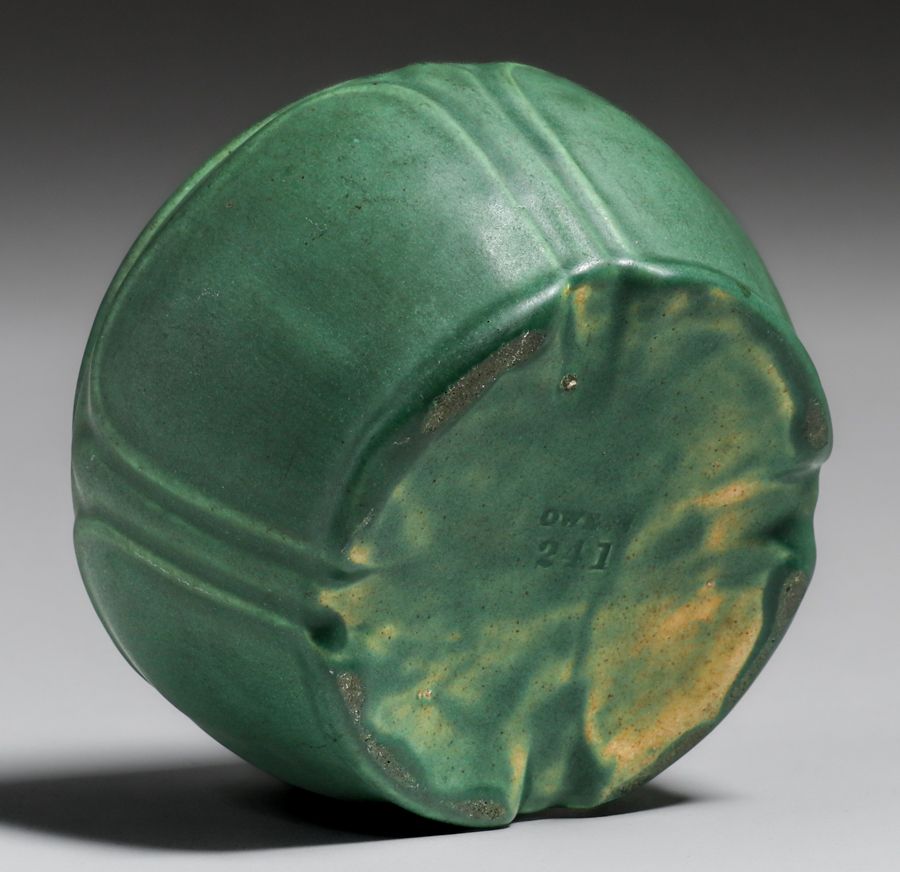 Owens Matte Green #241 Small Jardiniere c1910. Signed. A couple of interior glaze bubbles, otherwise perfect condition. 5.75d x 3.5h inches SOLD