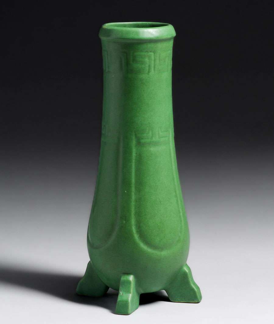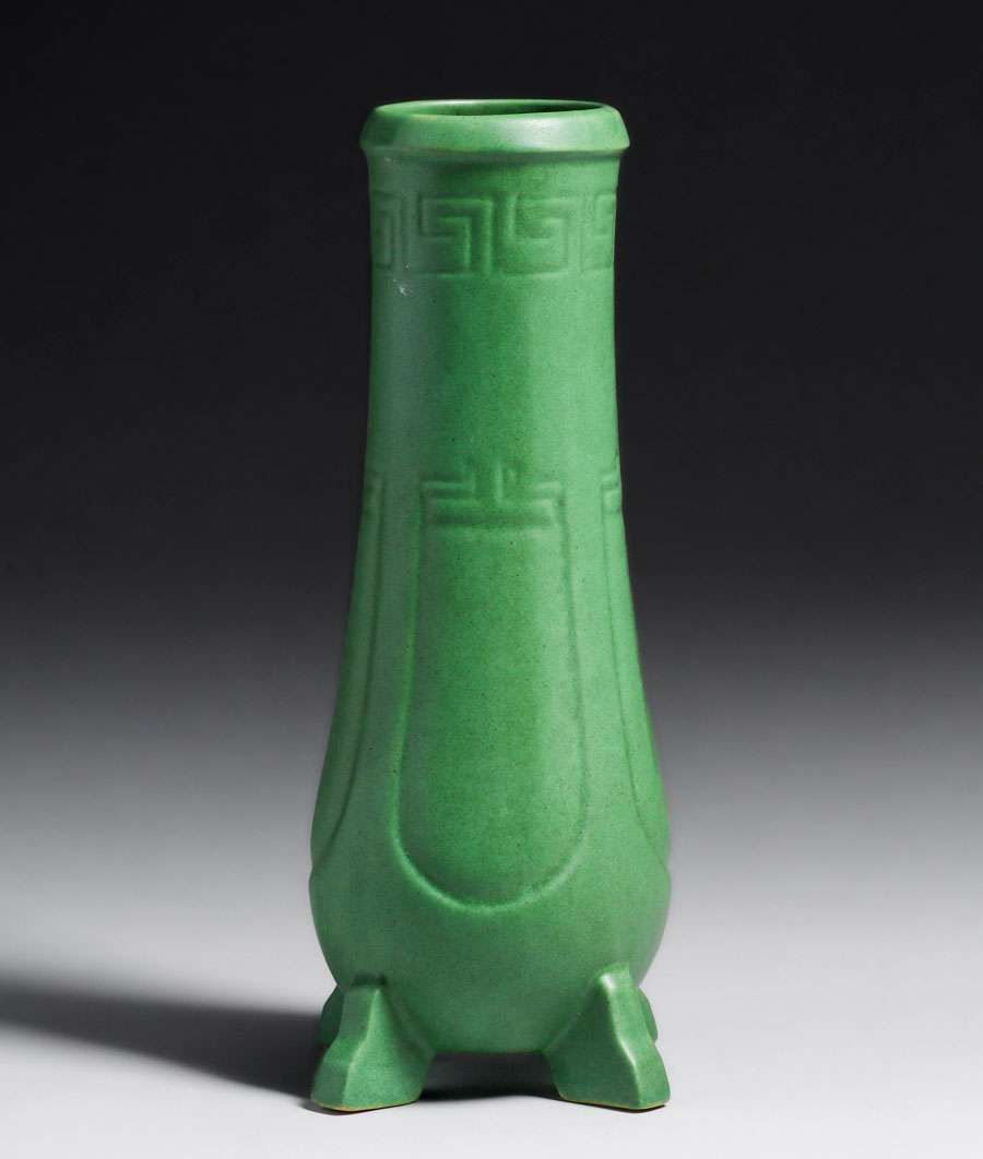 Owens Pottery Matte Green Vase c1910. Glazed over signature. Invisible professional restoration to small foot chips, otherwise perfect condition. 11"h x 5"d SOLD