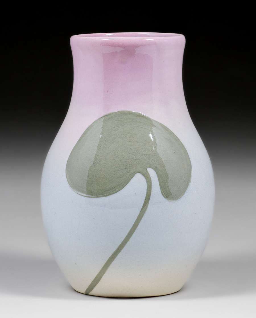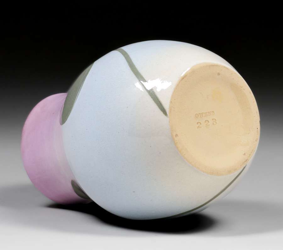 Owens Pottery Mushroom Vase c1900s. Signed. Invisible professional restoration to edge chip, otherwise perfect condition. 8 5/8"h x 5"d SOLD