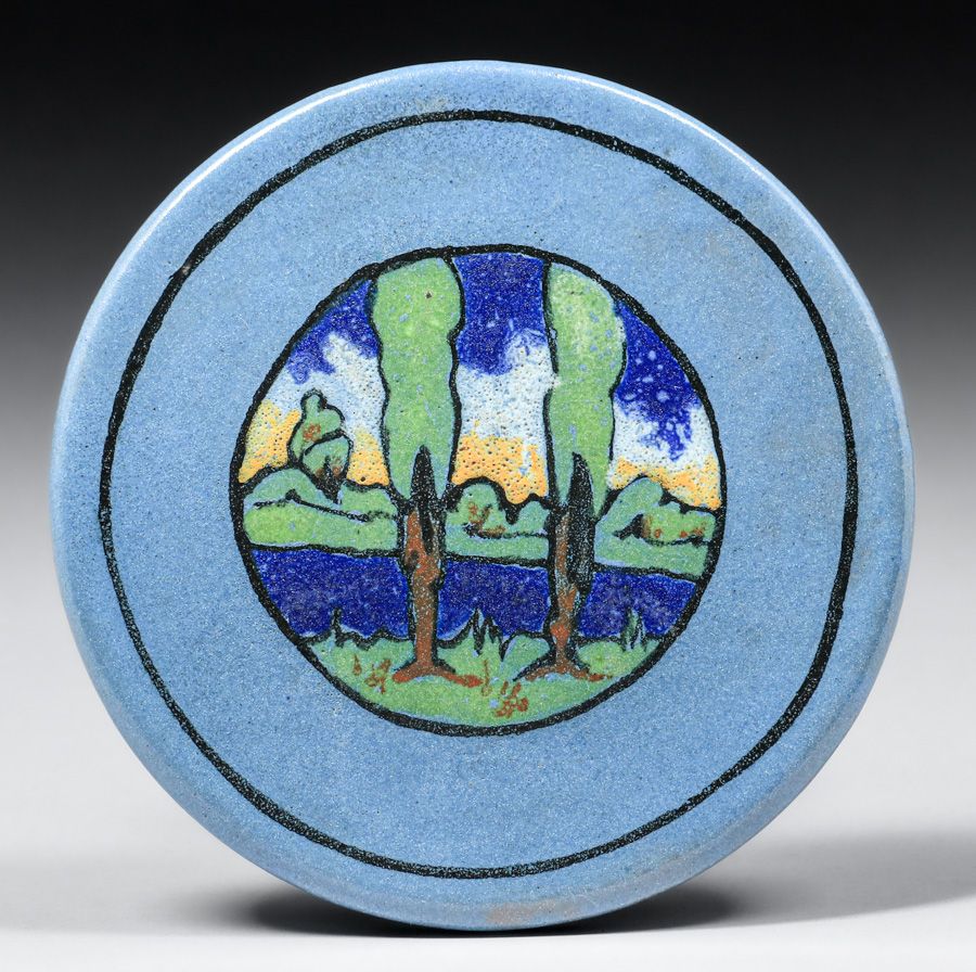 Paul Revere Pottery Arthur Wesley Dow Influenced Double Tree Landscape Decorated Tile 1928. Signed. Perfect condition. 5.5"d SOLD