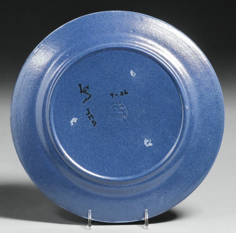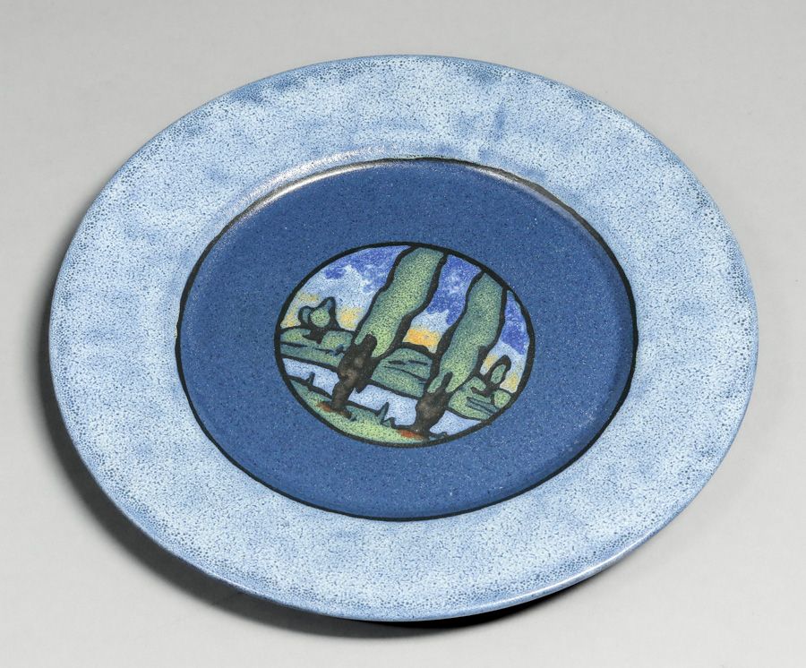 Paul Revere Pottery Lili Shapiro Arthur Wesley Dow Influenced Double Tree Landscape Decorated Plate 1926. Signed. Perfect condition. 10″d SOLD