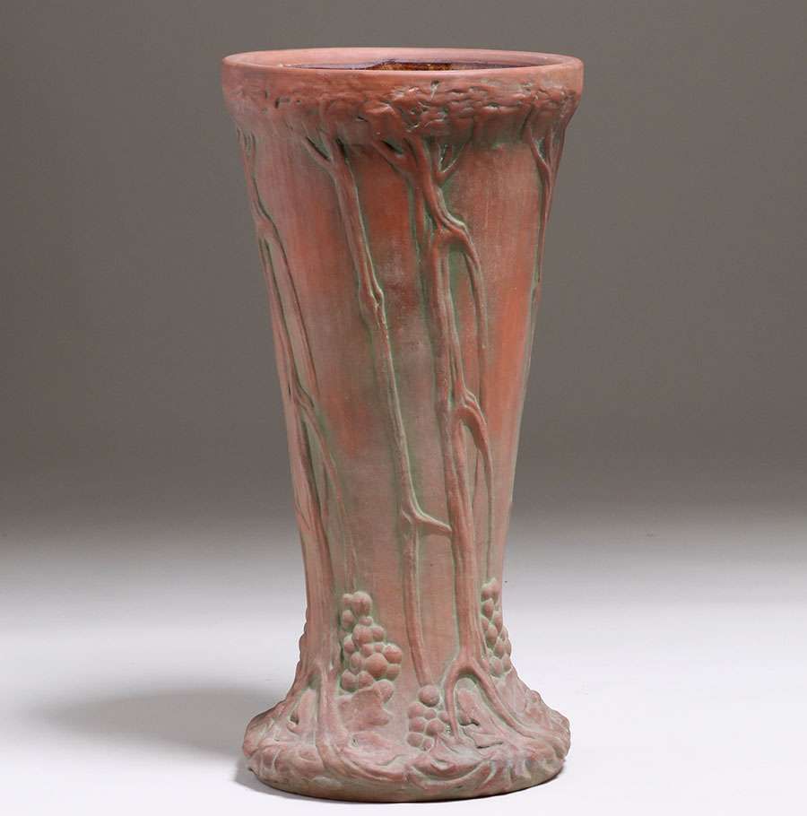 Large Peters & Reed Moss Aztec Umbrella Stand c1910s. Unsigned. Invisible professional restoration to two small chips, otherwise perfect condition. 22.75"h x 11.5"d SOLD