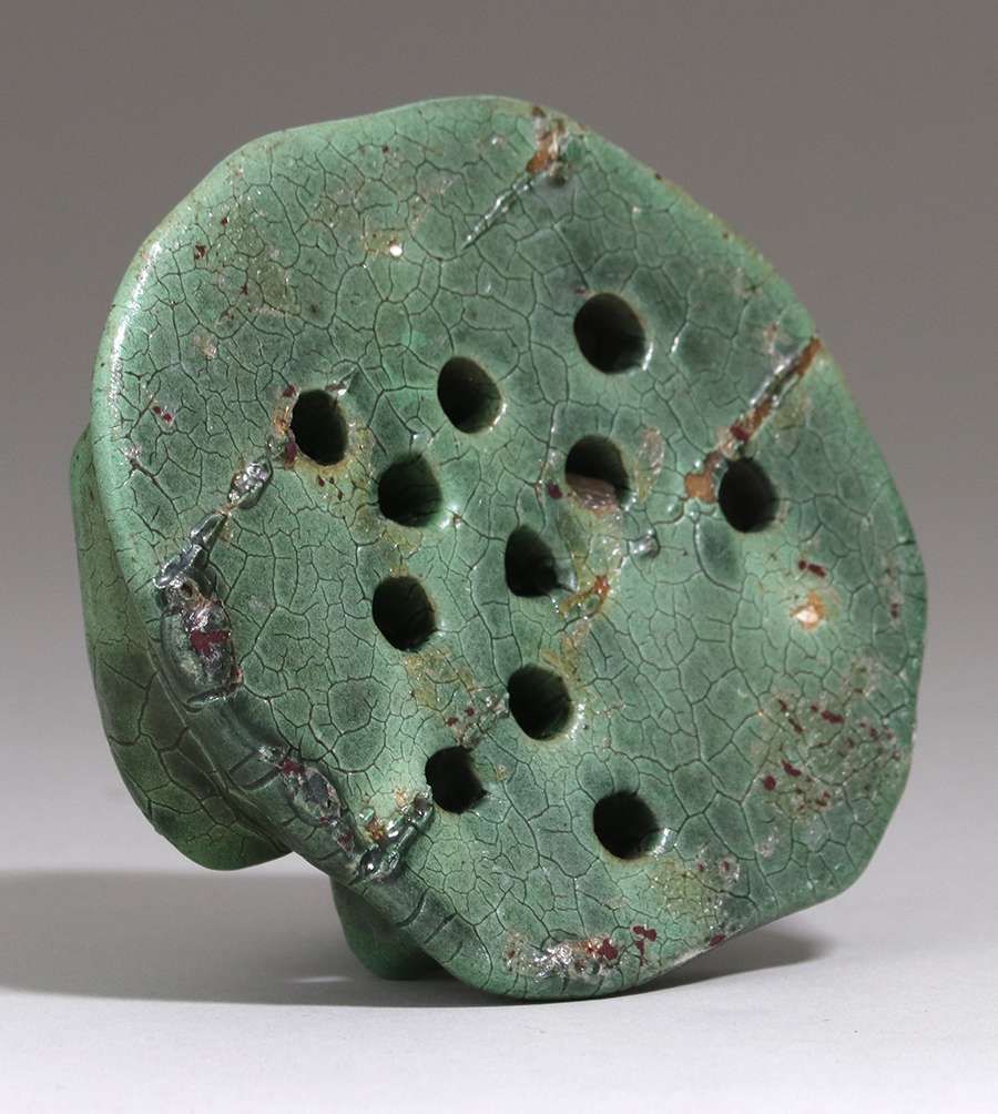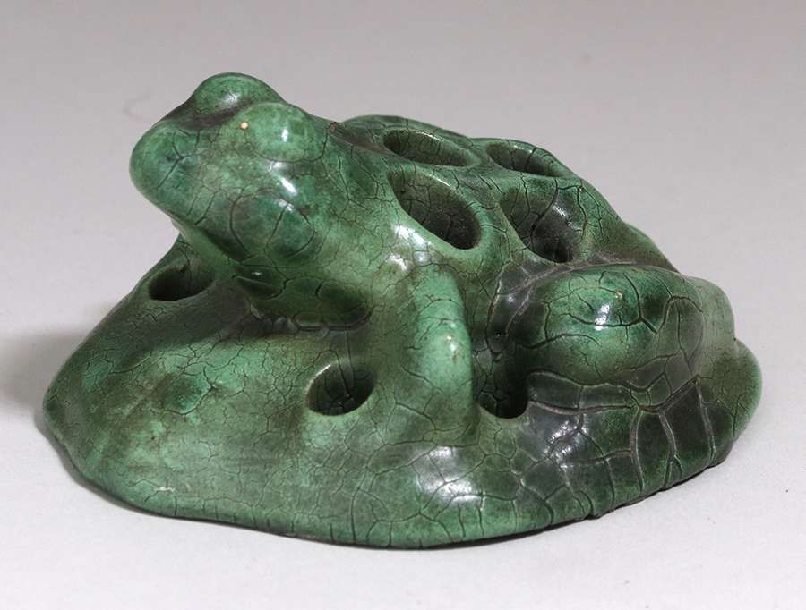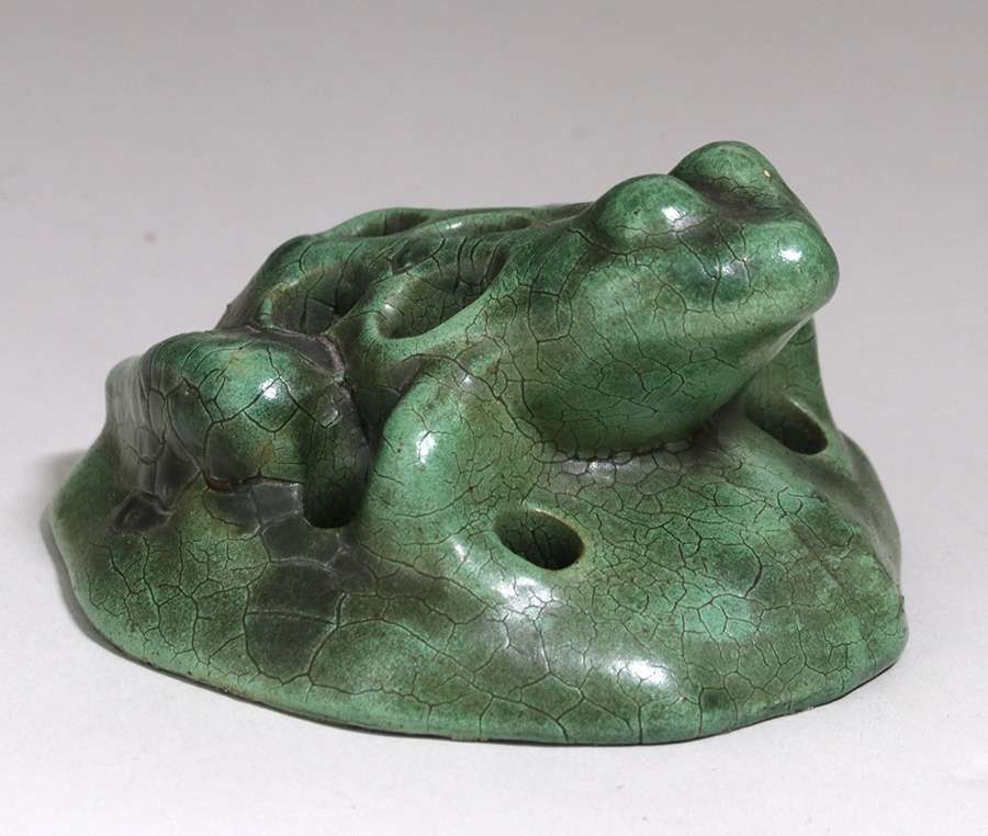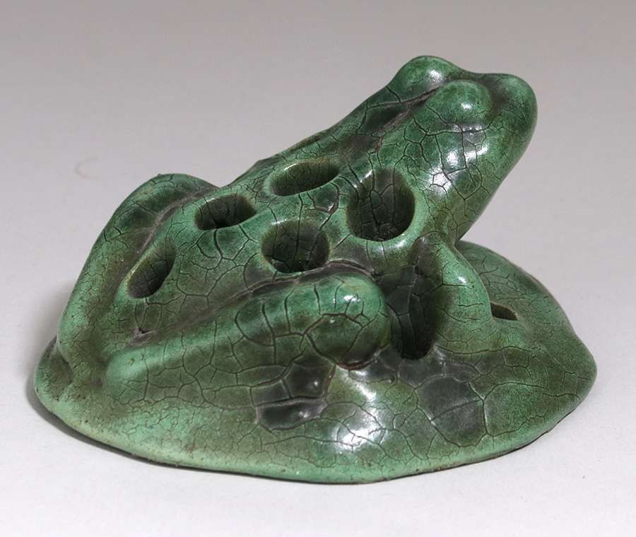 Peters & Reed - Zanesville, OH dark matte green flower frog. Unsigned. Perfect condition. 4.75" x 4" x 2.75"h SOLD