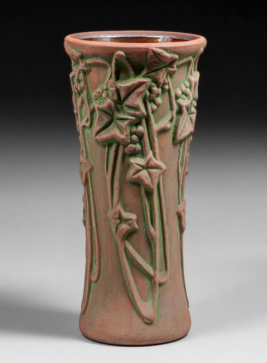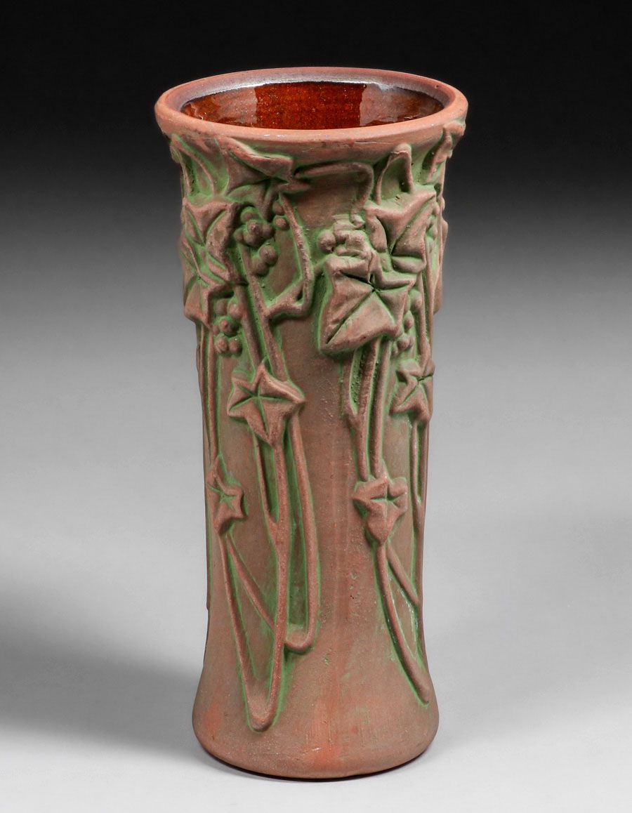 Peters & Reed Moss Aztec Vase c1910s. Unsigned. Perfect condition. 12”h x 5.5”d SOLD