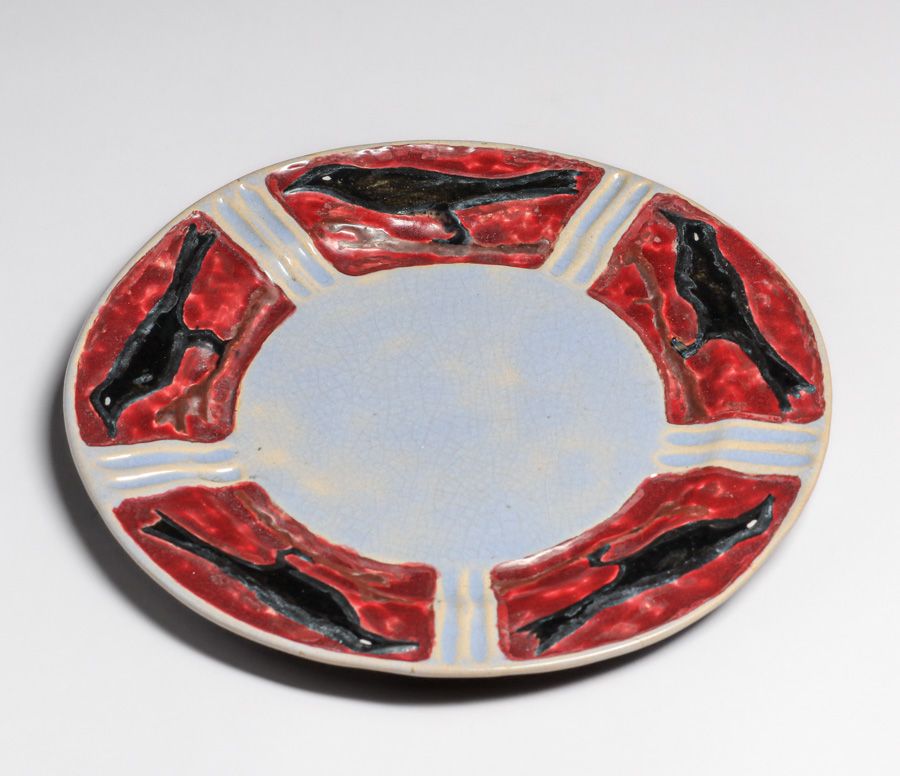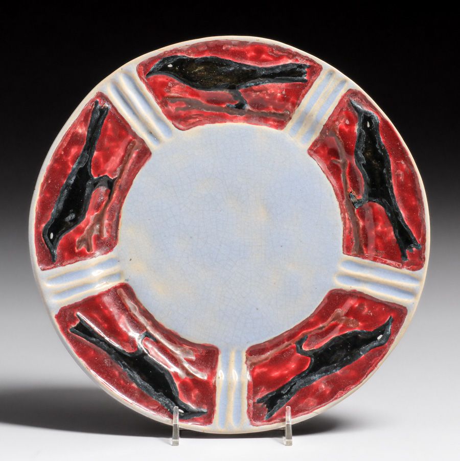 - Early Pewabic Pottery Hand-Carved Raven Plate c1905