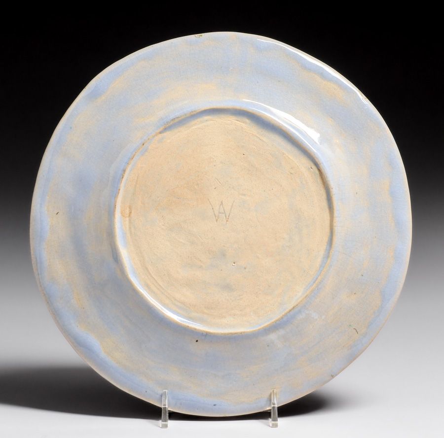 Early Pewabic Pottery Hand-Carved Raven Plate c1905. Artist signed "A.W." Tight hairline appears to be a heavy craze line, otherwise perfect condition. 9.25"d $2200