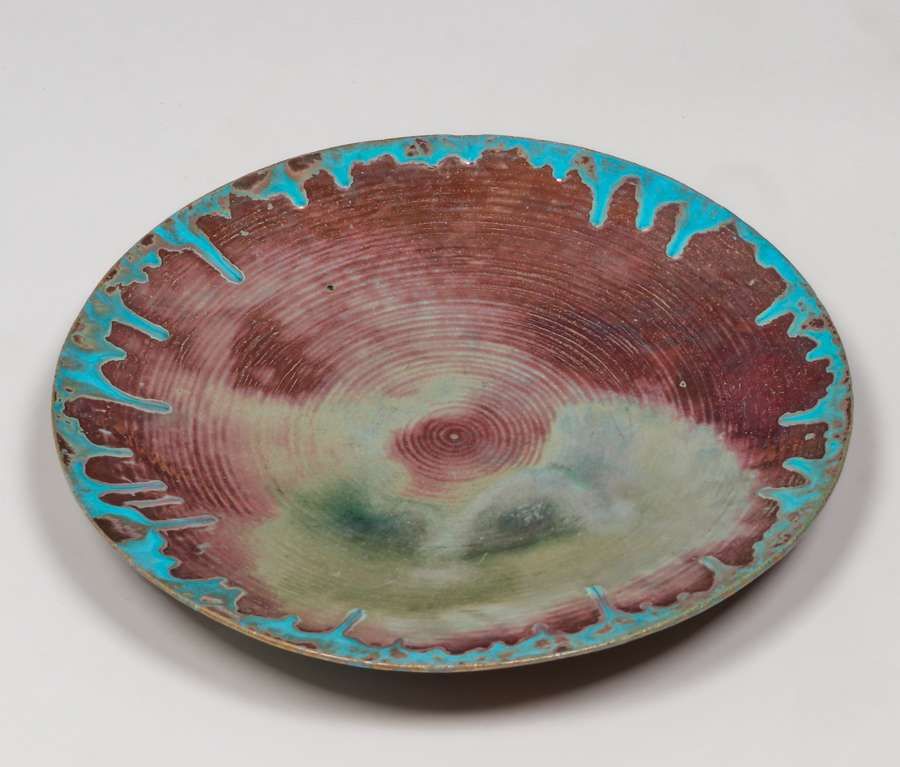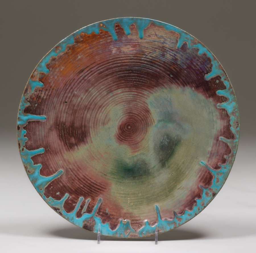 Large Pewabic Pottery Charger c1920s. Fantastic iridescent drip glaze. Invisible professional restoration to small edge chip, otherwise perfect condition. 14.25"d SOLD