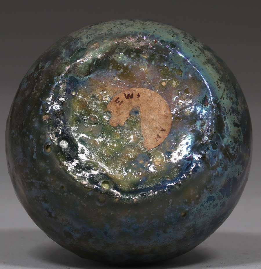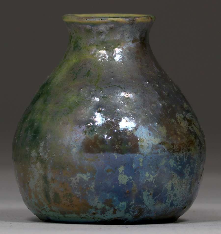 Pewabic Pottery Gourd-Form Vase with a warty, bright-green and gray iridescent metallic glaze. Signed with remnant of early paper label. Perfect condition. 3.5"h x 3.25"d SOLD