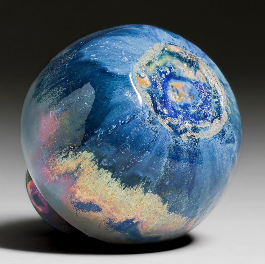 Pewabic Pottery Iridescent Blue Bulbous Vase c1930s. Interesting impression on side of vase looks like a stylized butterfly, but is probably just a kiln kiss. Signed. Perfect condition. 5.25"h x 5"d SOLD