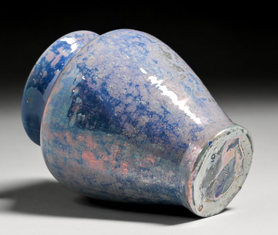 Pewabic Pottery Iridescent Blue Vase c1930s. Signed. Invisible professional restoration to small grinding chip, otherwise perfect condition. 7"h x 5.25"d SOLD