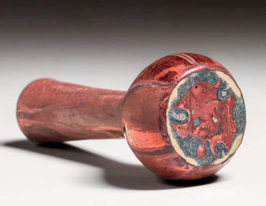 Pewabic Pottery Iridescent Red Glazed Vase c1920s. Partially glazed over signature. 6.5"h x 2.75"d SOLD