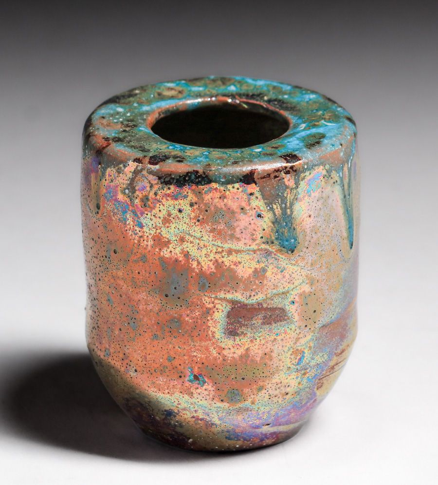 Small Pewabic Pottery Iridescent Flat Top Vase c1930s. Signed. Perfect condition. 2.5”h x 2”d SOLD