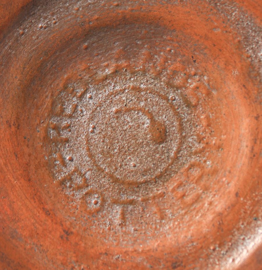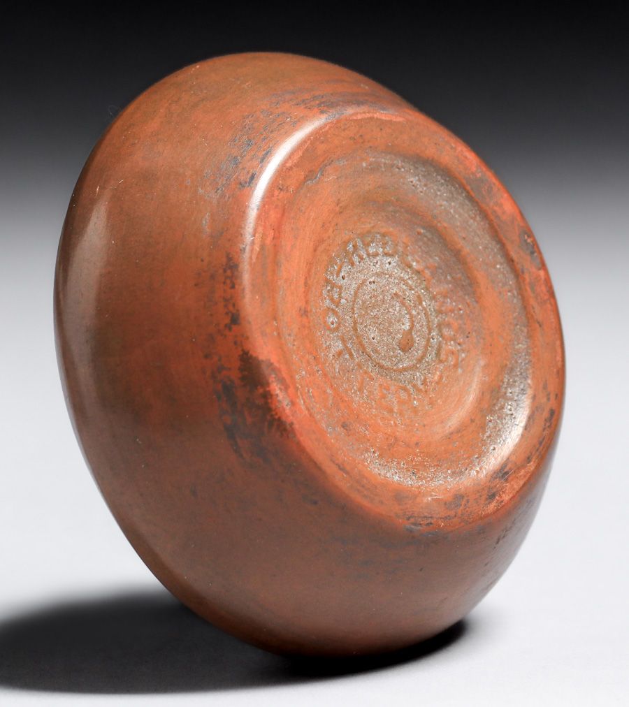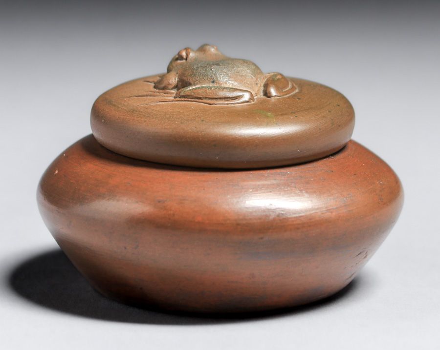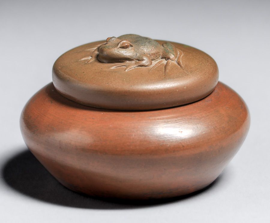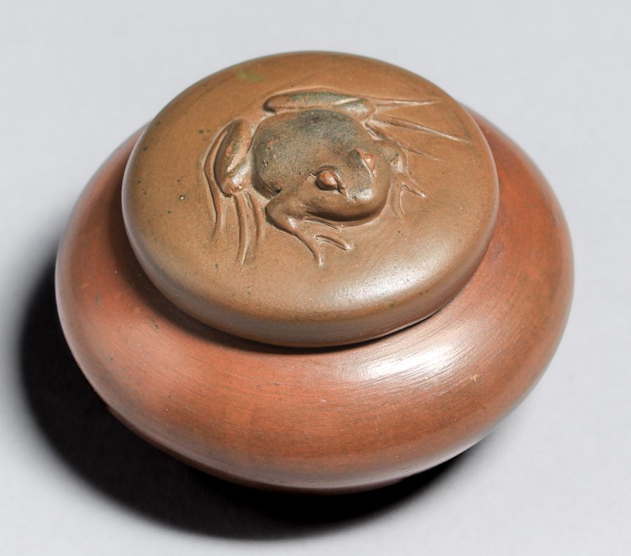 Rare Redlands Pottery Covered Frog Vase c1905. Signed with raised Redland Pottery mark. Redlands Pottery is among the rarest of California Potteries. Invisible professional restoration to small chip on inside of lid, otherwise perfect condition. 3.25″d x 2″h SOLD