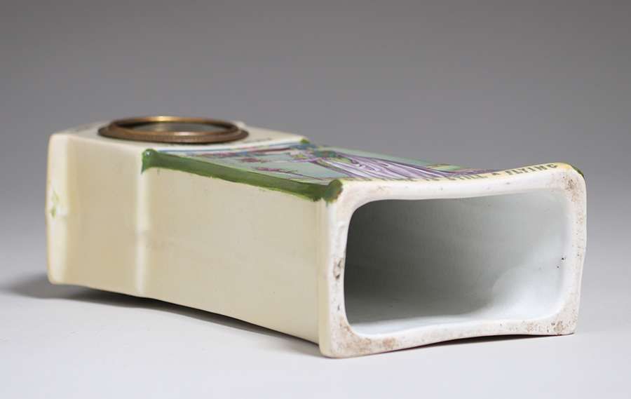 Frederick Rhead for Foley Pottery (England) mantle clock c1897-1900 with painted Pre-Raphaelite design “Gather Ye Rosebuds While Ye May Old Time is Still a Flying”. Invisible professional restoration to small edge chips, otherwise perfect condition. 11″h x 4.75″w x 2.75″d SOLD