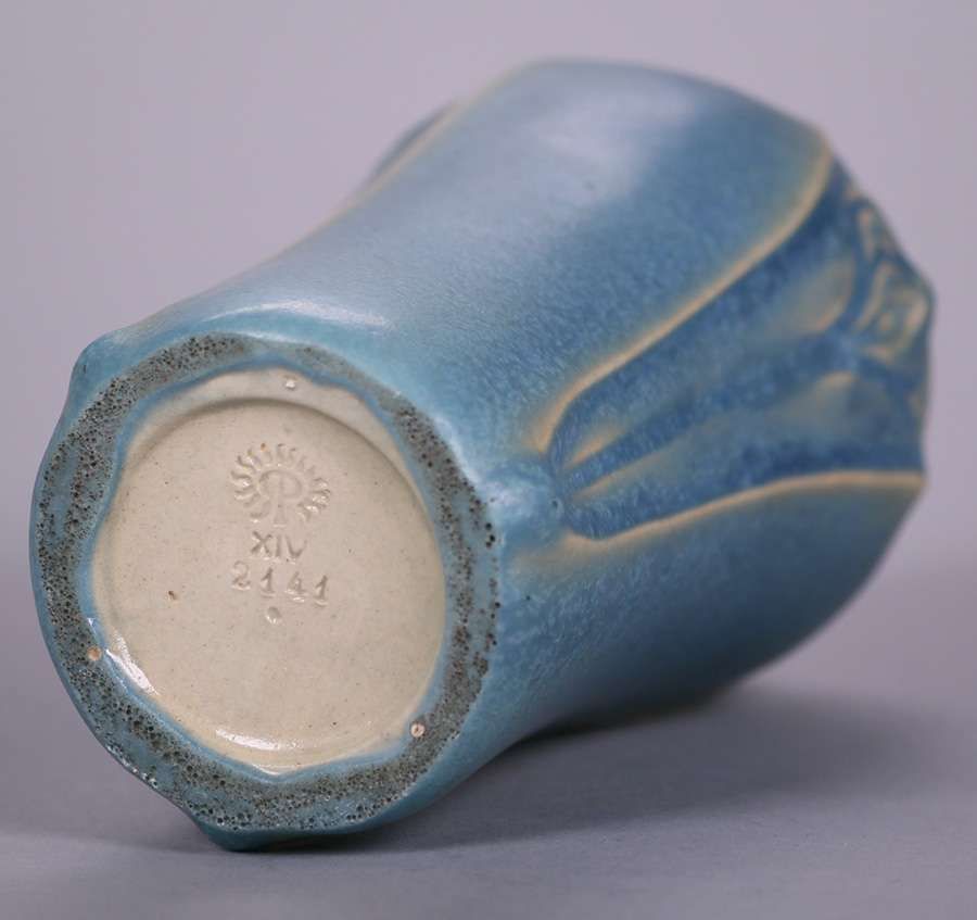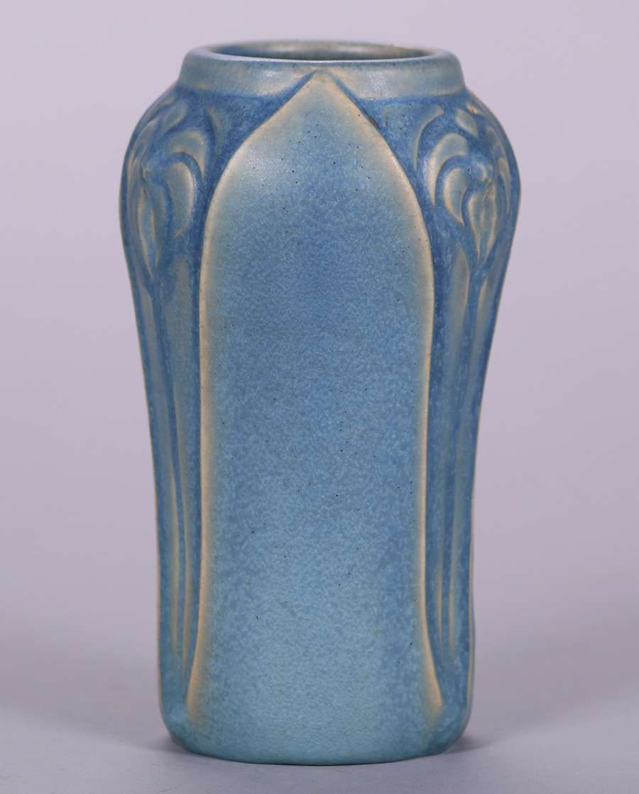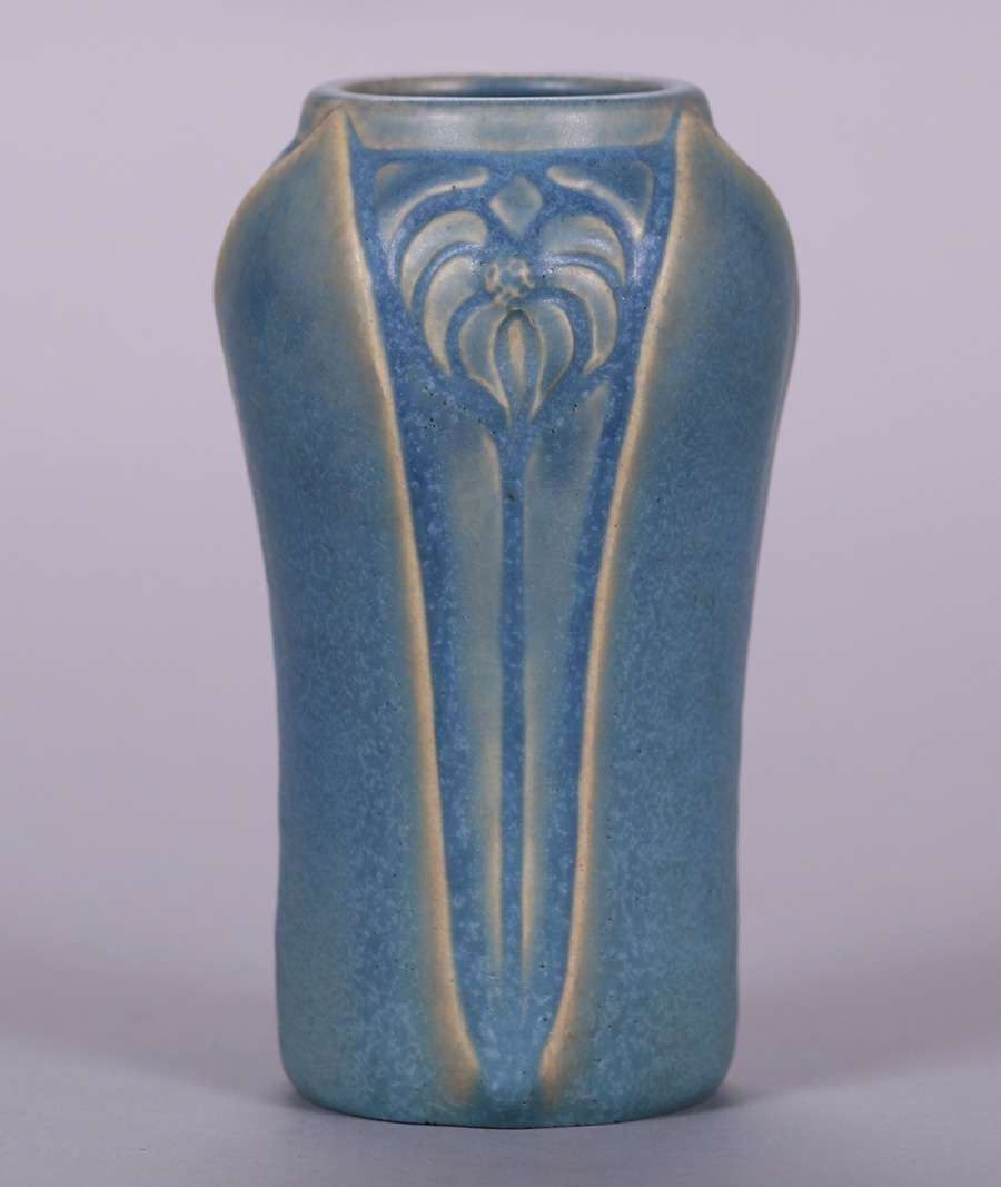 Rookwood matte blue vase with incised stylized floral design. 1914. Perfect condition. 6.25"h x 3.5"d SOLD