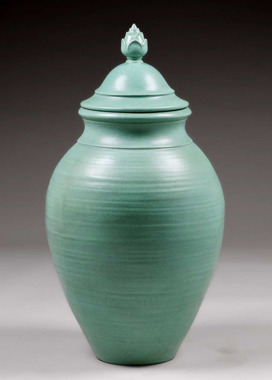 Rookwood Faience #8076Y Garden Temple Jar c1910. Signed. Invisible professional restoration to firing line and small chip to lid, otherwise perfect condition. 35"h x 16.5"d SOLD