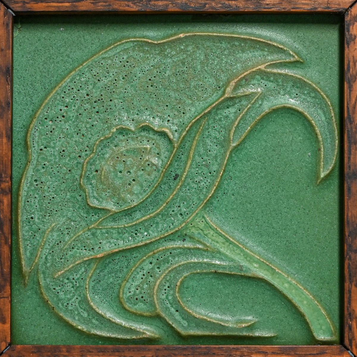 Rookwood Faience Magnolia Blossom Tile c1910. Signed. A couple of flea bites to high points of relief, otherwise perfect condition. Tile 6" x 6". Oak frame 9" x 9"