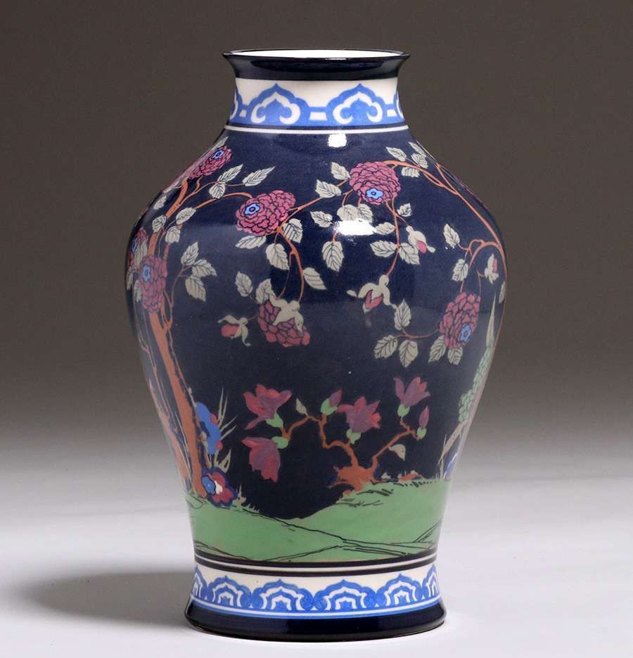 Large Rookwood jeweled porcelain vase decorated with Japonesque prunus trees by Arthur Conant dated 1917. Invisible professional restoration to rim chip, otherwise perfect condition and uncrazed. 14"h x 9"d SOLD