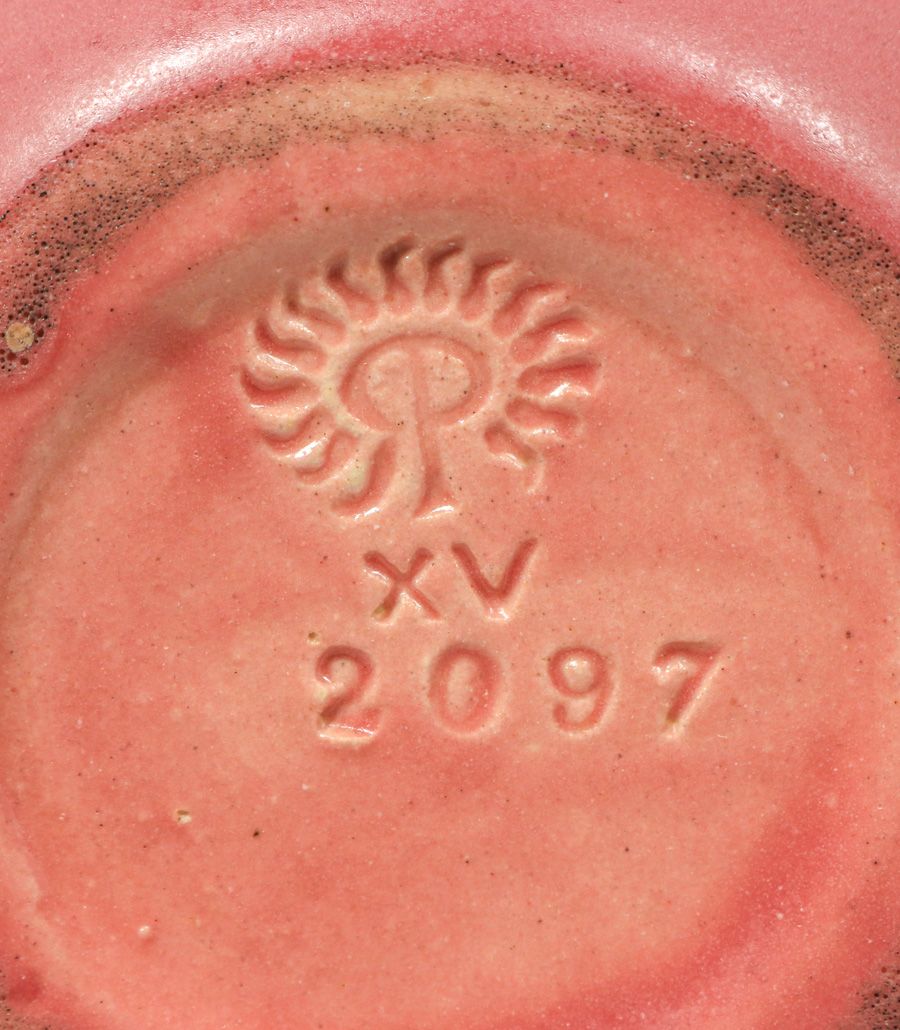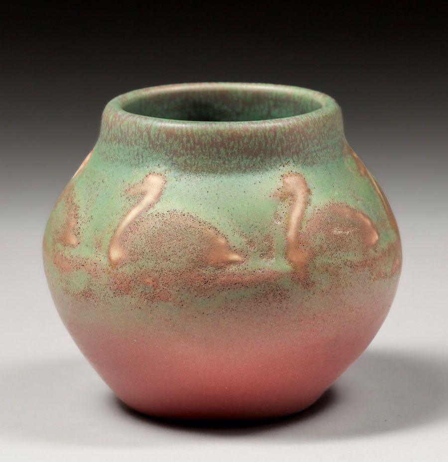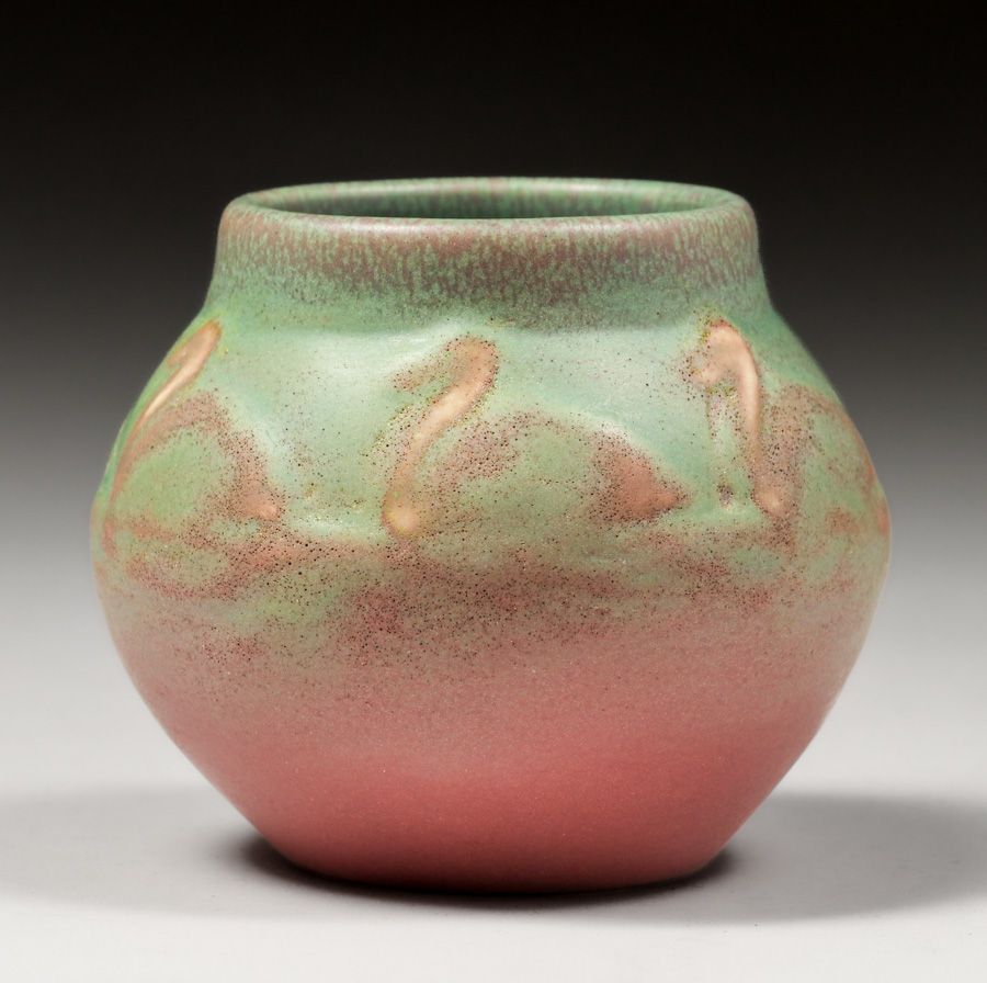 Rookwood Pottery #2097 Matte Green & Pink Swans Vase 1915. Signed. Perfect condition. 3 3/8"h x 3 7/8"d SOLD