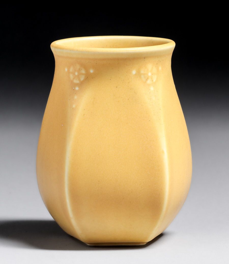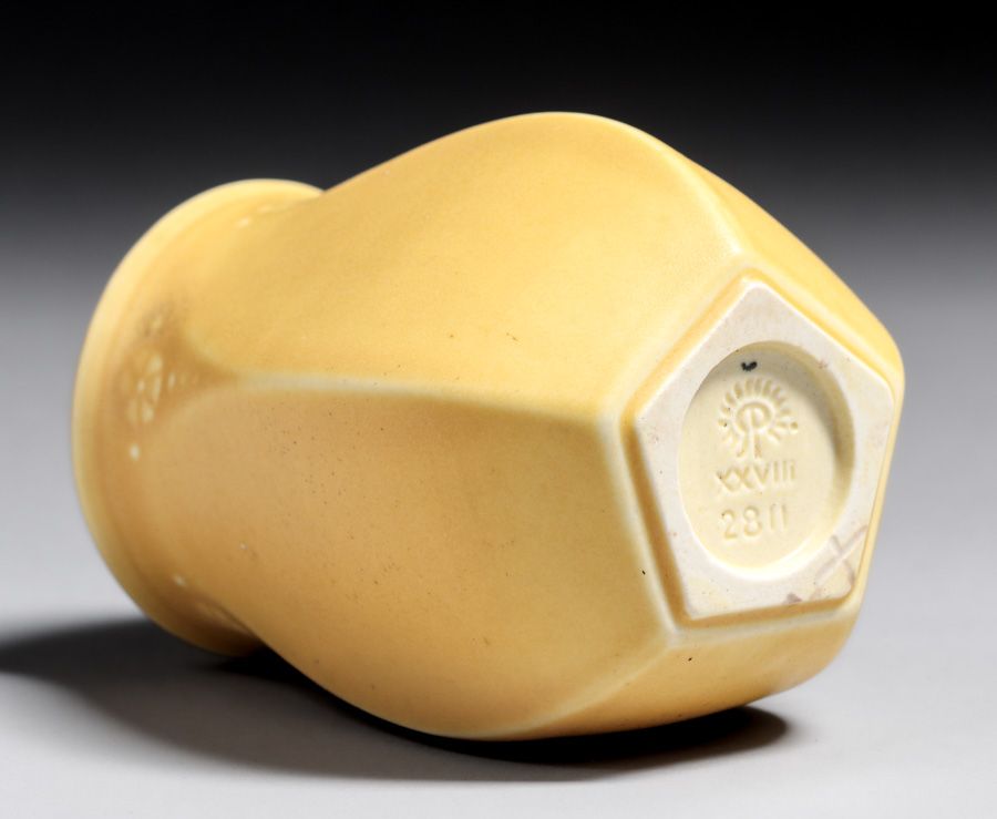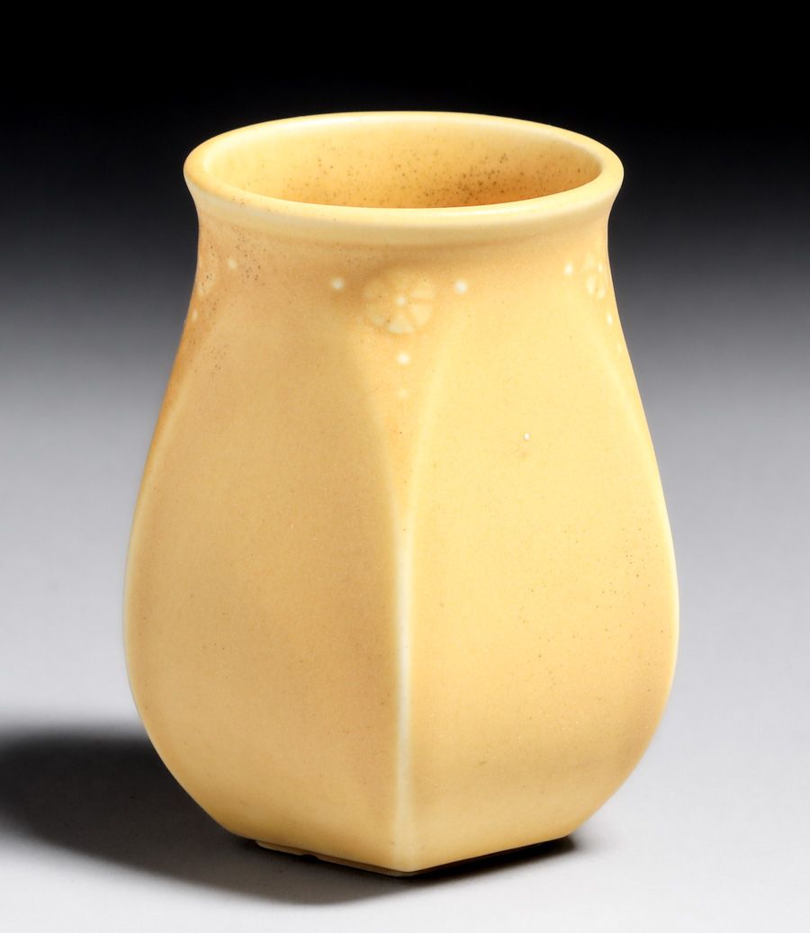 Rookwood Pottery #2811 Matte Yellow Vase 1928. Signed. X'd due to some light peppering, otherwise perfect condition. 4.5"h x 3.25"d SOLD