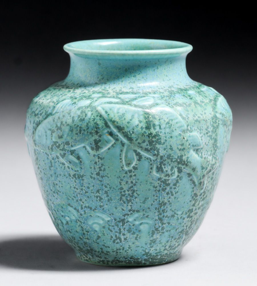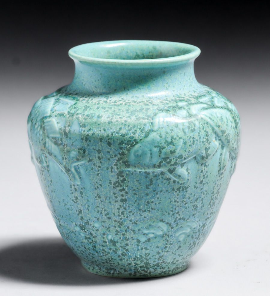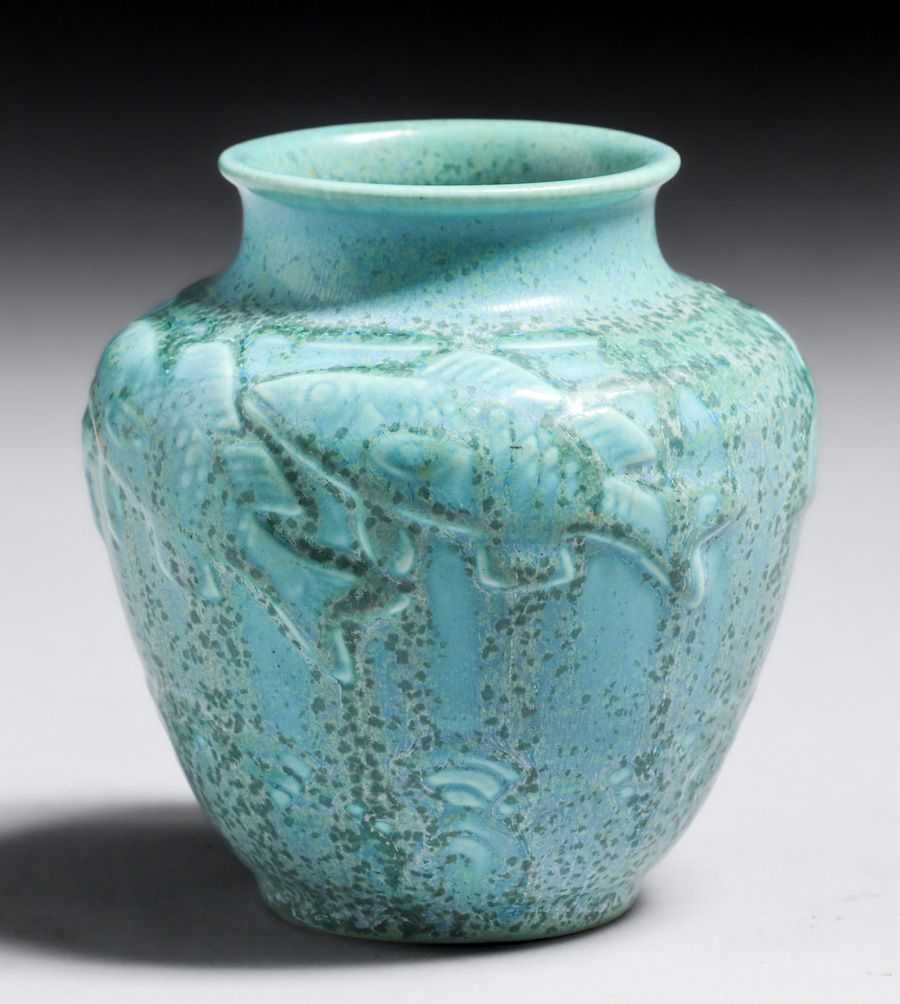 Rookwood Pottery #6487 Light Blue Crystalline Koi Fish Vase 1935. Kataro Shirayamadani design. Signed. Perfect condition. 4.5"h x 4.25"d SOLD