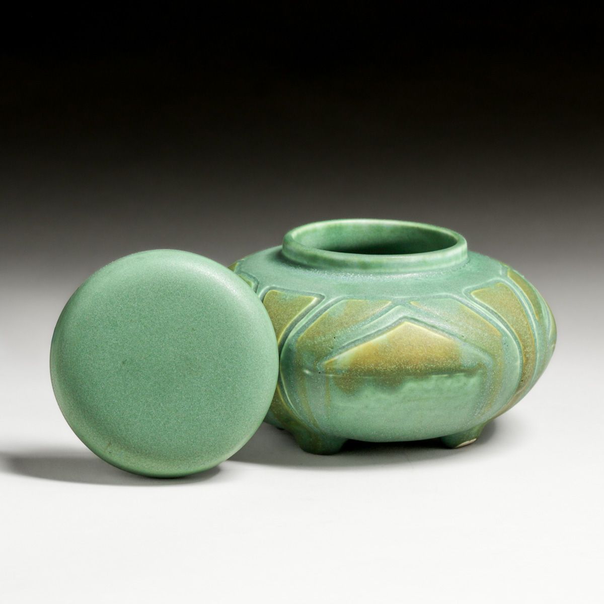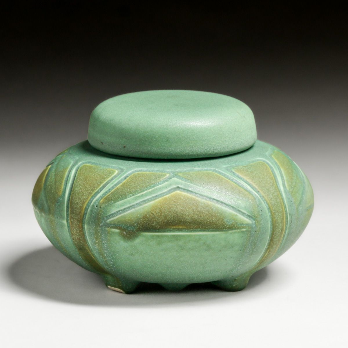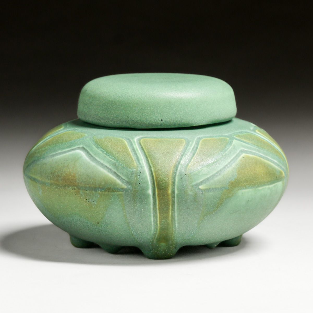 - Rookwood Pottery Hand-Carved Covered Matte Green Covered Vase c1910