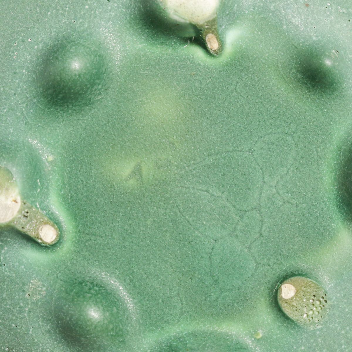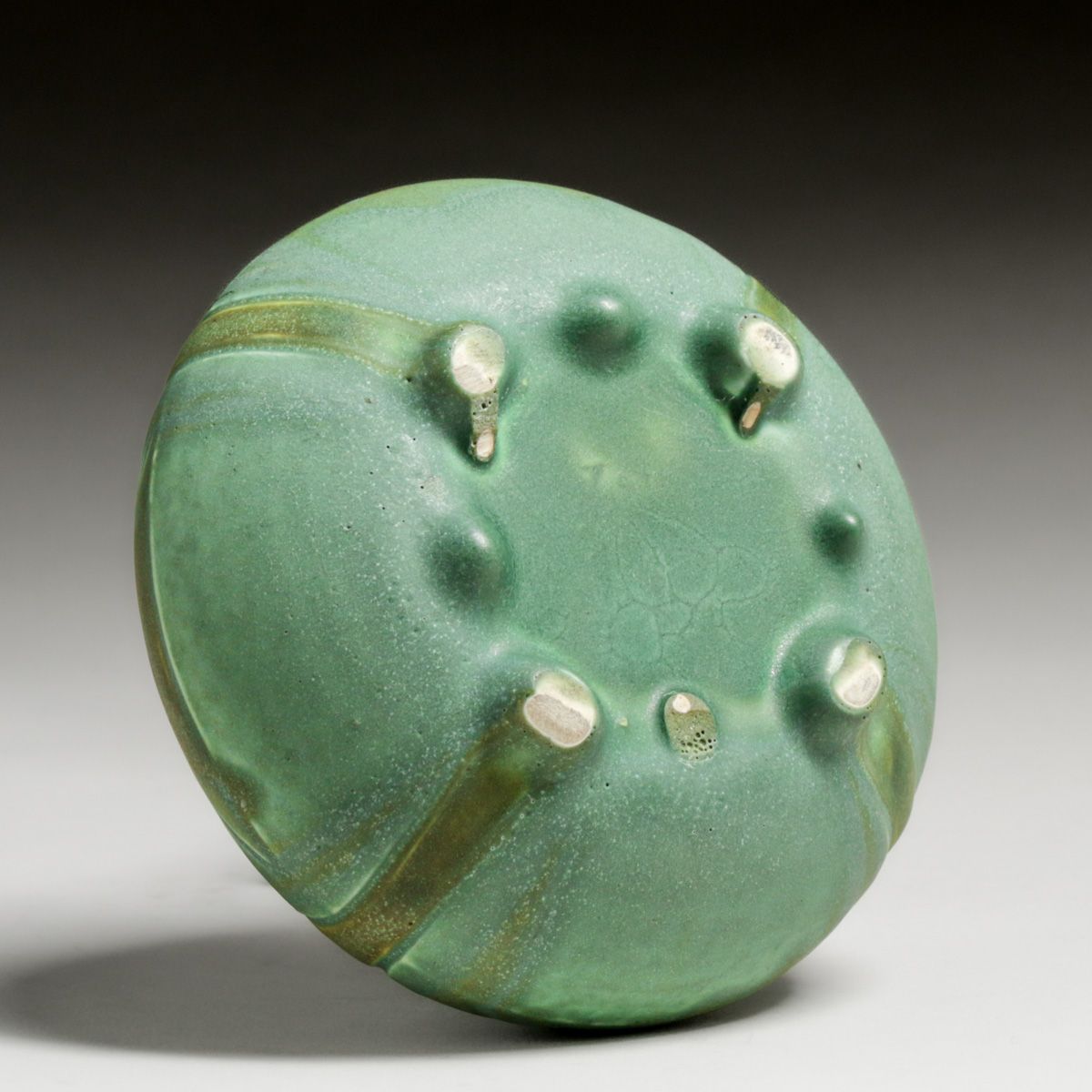 Rookwood Pottery Hand-Carved Covered Matte Green Covered Vase c1910. Most likely carved by Cecil A. Duell but the glaze covers up all of the markings except the "V" for vellum. Excess grinding to one foot, otherwise perfect condition. 5.5"d x 3.75"h