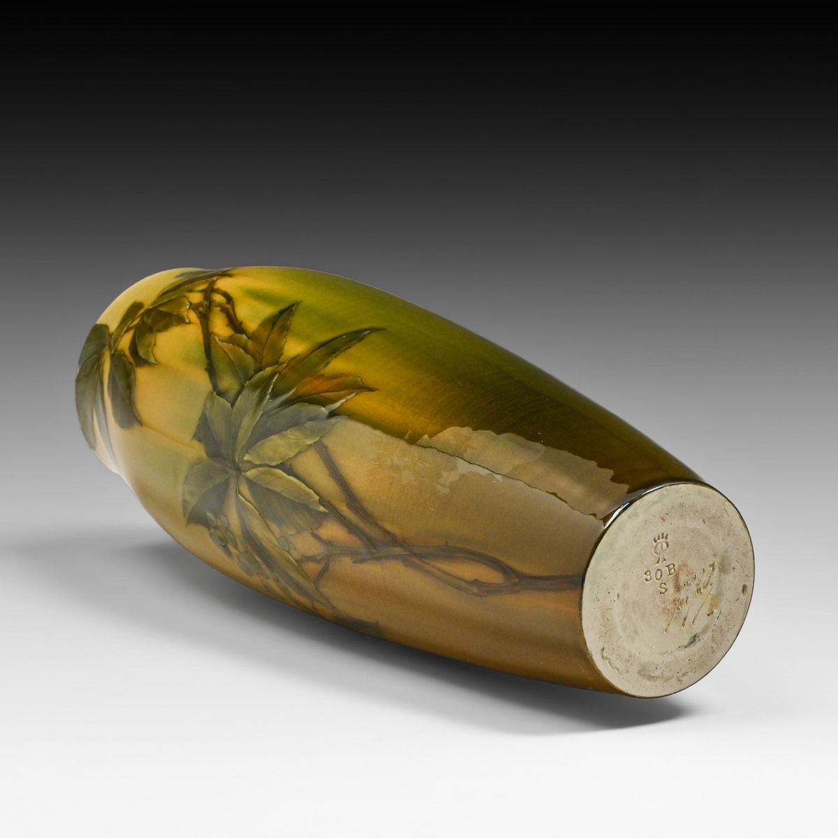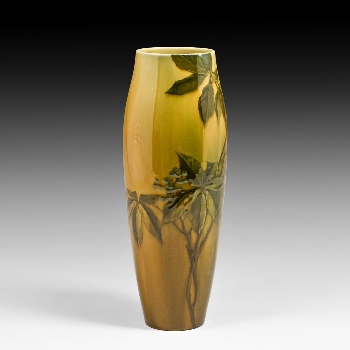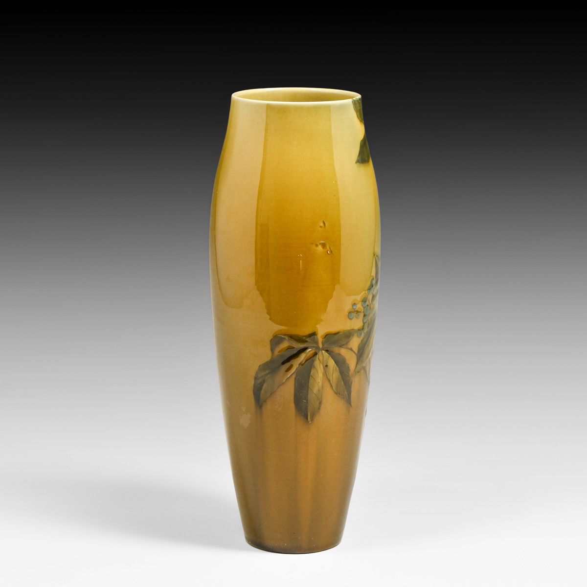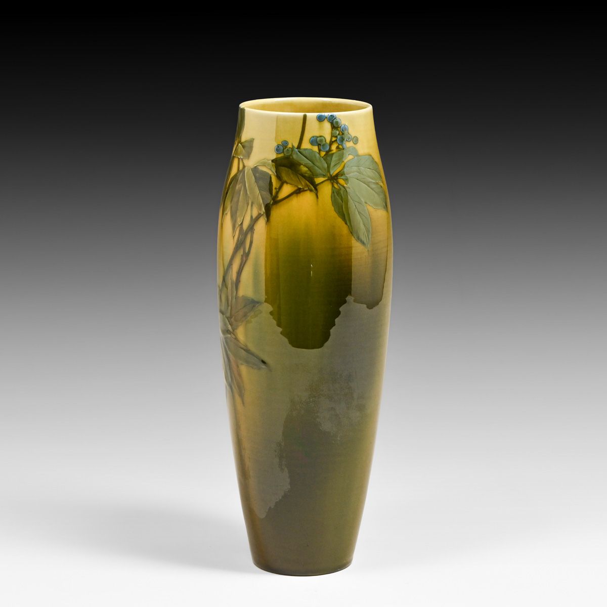 Rookwood Pottery Matthew Daly Standard Glaze Blueberry Vase 1890. Signed. Perfect condition. This vase exemplifies Daly’s naturalistic precision, featuring expertly rendered leaves and clusters of berries in a luminous underglaze slip. Significantly, the base is marked "S" for "made from a sketch," identifying this as a unique, artist-driven variation rather than a standard production-mold piece. 11.5"h x 4.25"d