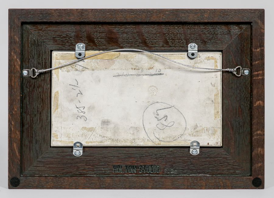 Rookwood Pottery Scenic Plaque 1915. Artist signed "E.V.H." Perfect condition. Tim Holton custom oak frame. 5 1/8h x 9 3/8w. Frame 10h x 14w inches $4800