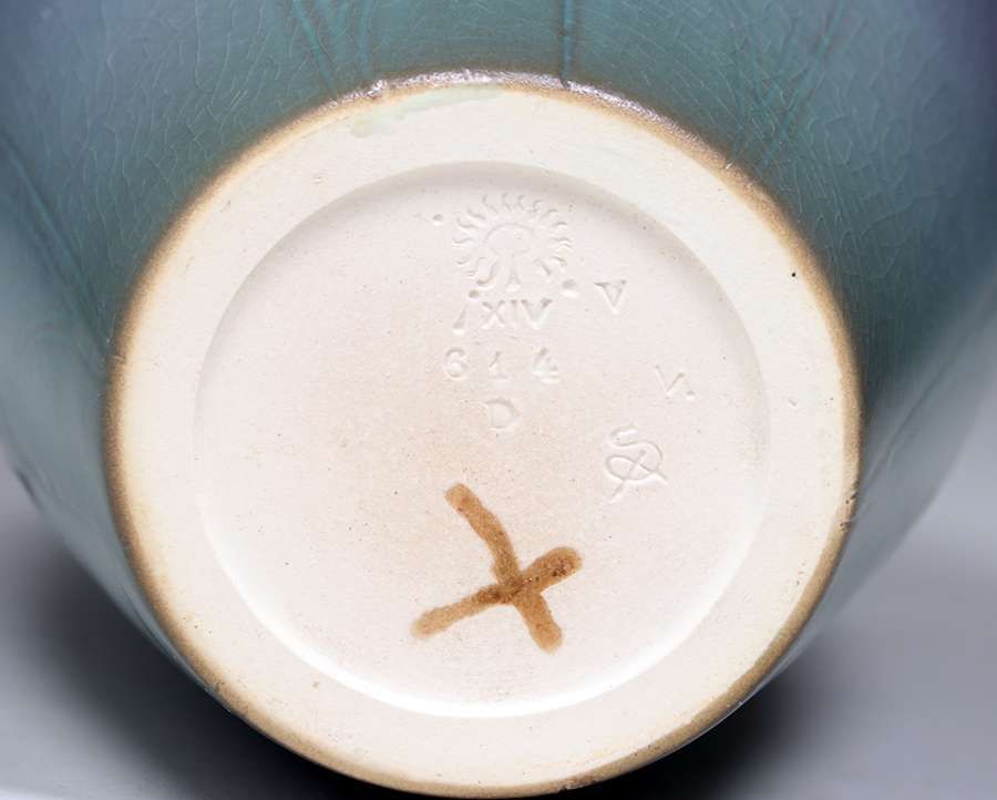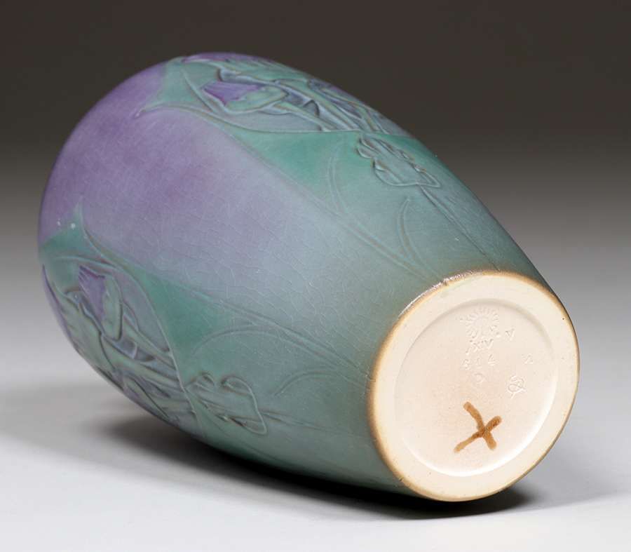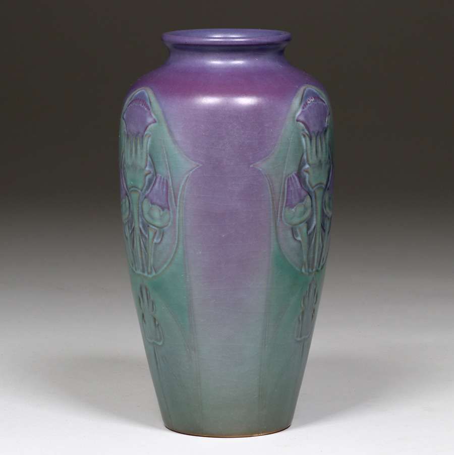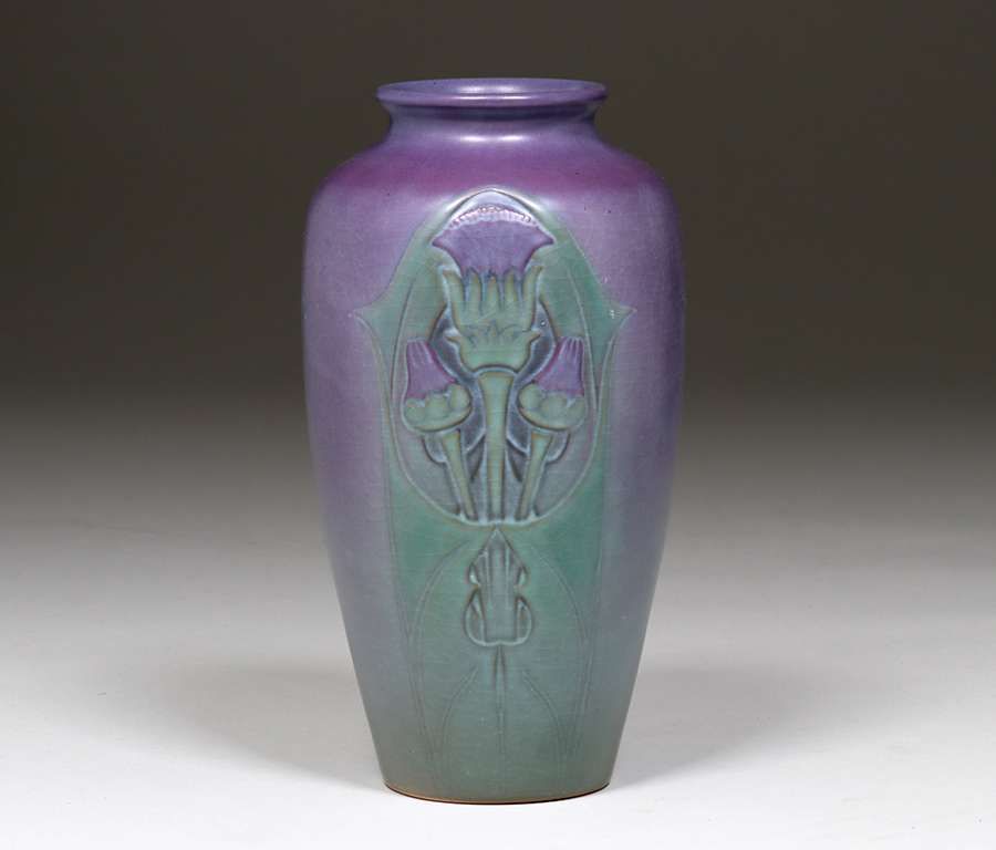 - Rookwood Sara Sax Carved Purple & Green Thistle Vase 1914