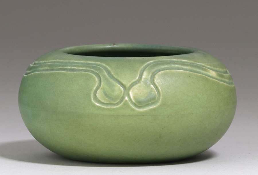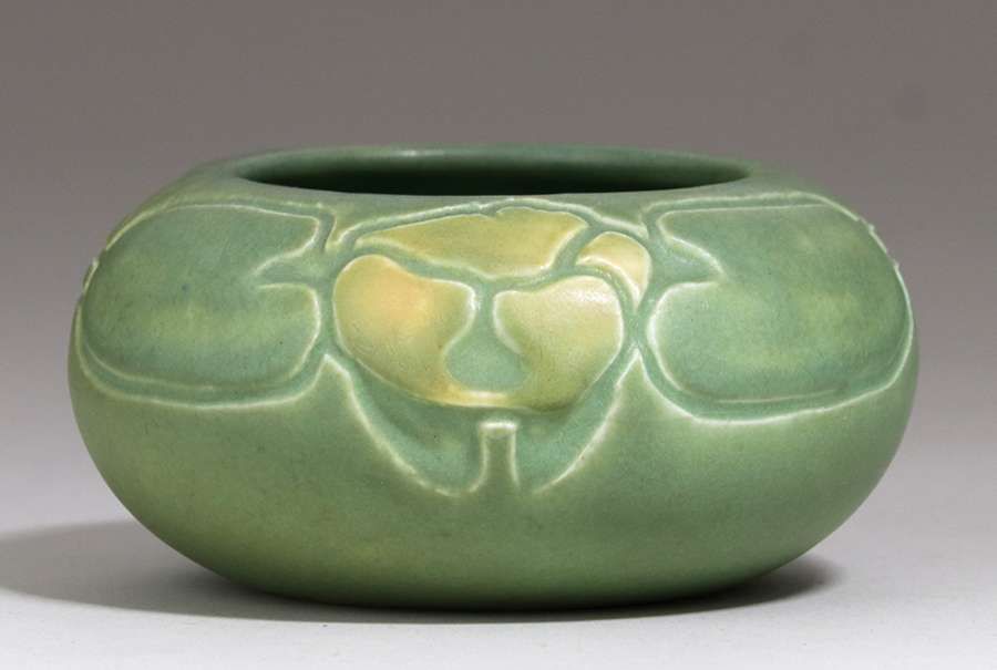 Rookwood Pottery closed bowl with hand carved water lily motif by Albert Pons dated 1906. Perfect condition. 5"d x 2.5"h SOLD
