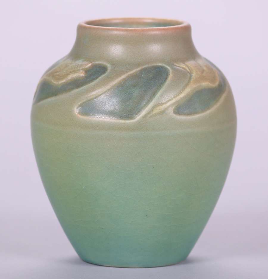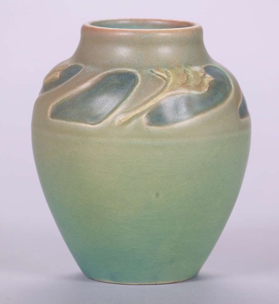 Rookwood matte green vase with carved stylized geese by William Henschel c1908. Perfect condition. 5.75"h x 4.5"d SOLD