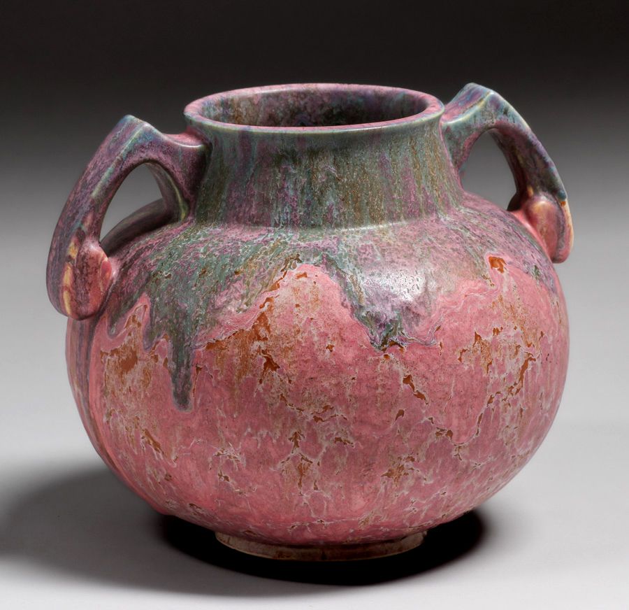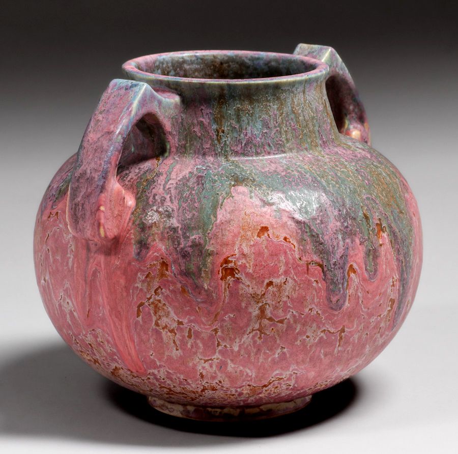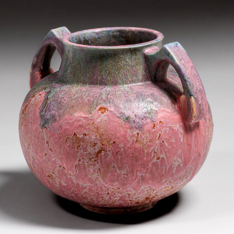 Large Roseville Carnelian II Two-Handled Vase c1920s. Unsigned. Perfect condition. 10"d x 9"h SOLD
