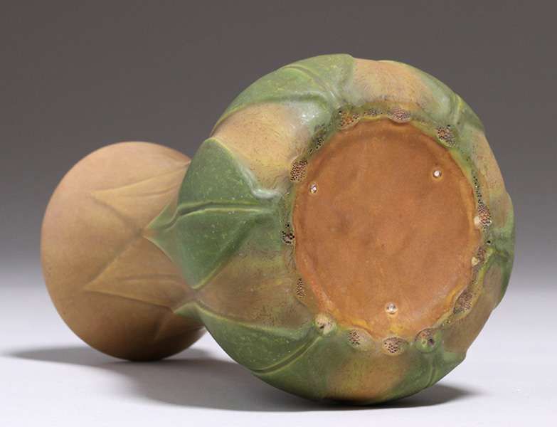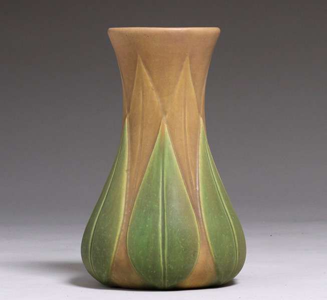 Large Roseville Early Velmoss flared vase. Unsigned. Invisible professional restoration to tight hairline, otherwise perfect condition. 11.75"h x 7"d SOLD
