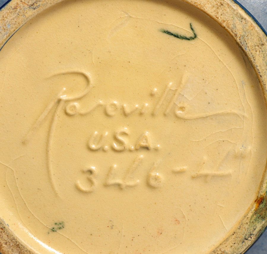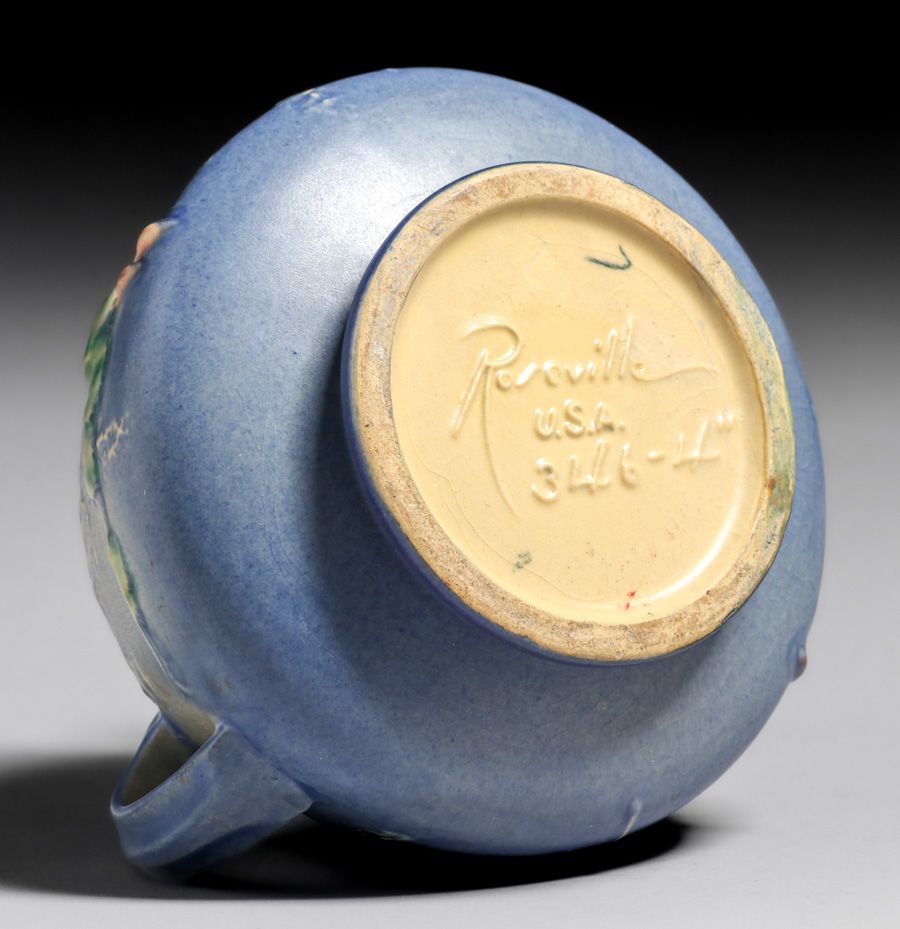 Roseville #346 Blue Fuchsia Two-Handled Vase c1930s. Signed. Perfect condition. 7.5"w x 4"h SOLD