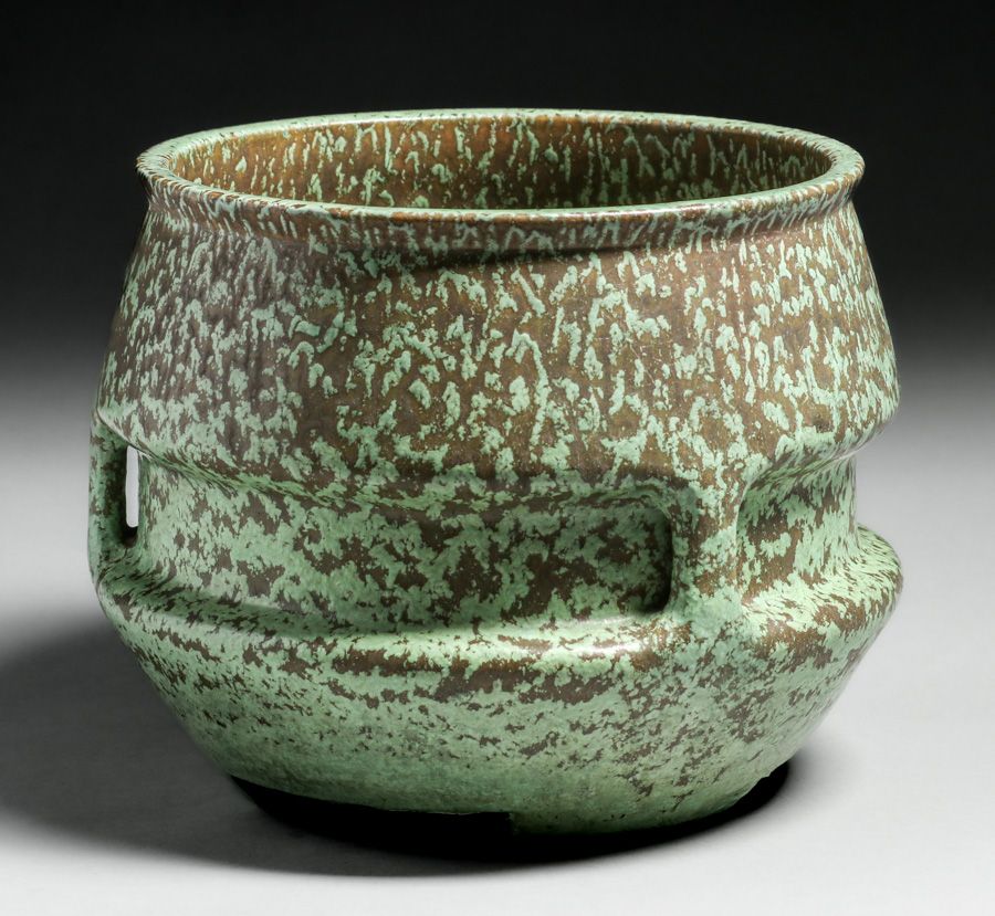 Roseville Chloron Matte Green Jardiniere c1910s. Unsigned. Some roughness to underside glaze drips, otherwise perfect condition. 10.25″d x 8.75″h SOLD