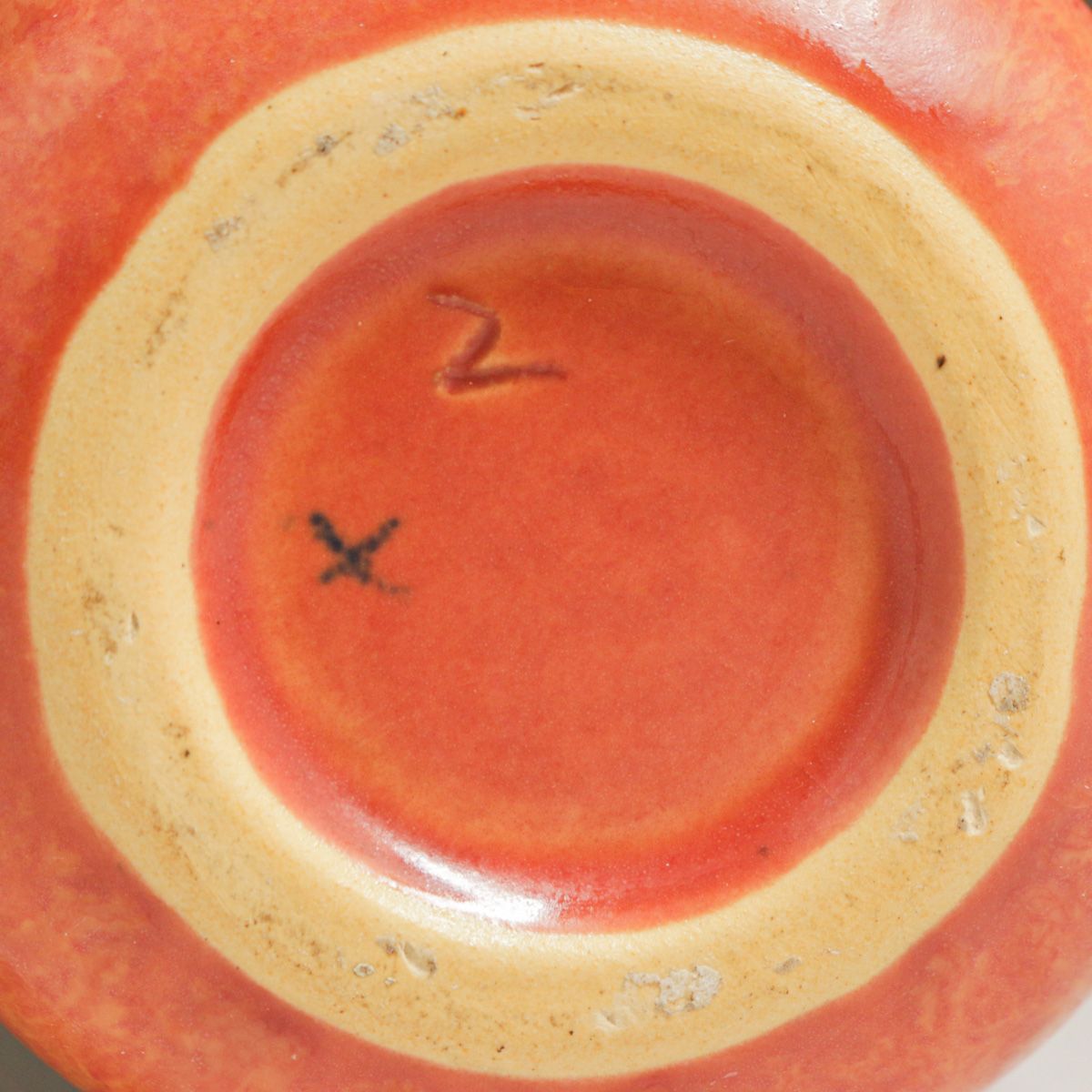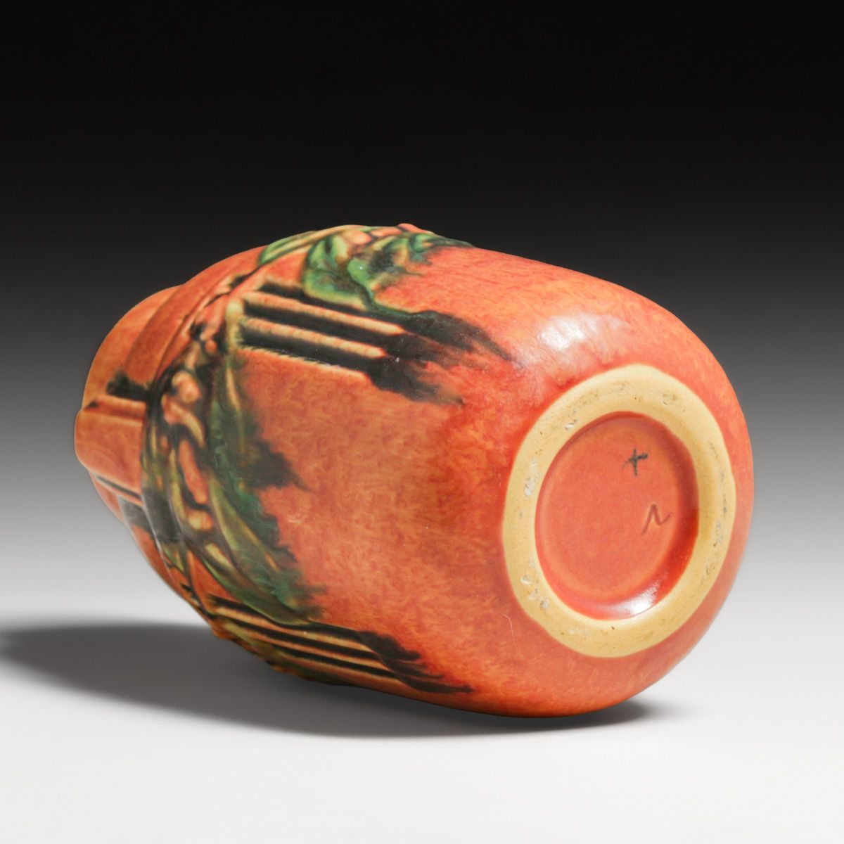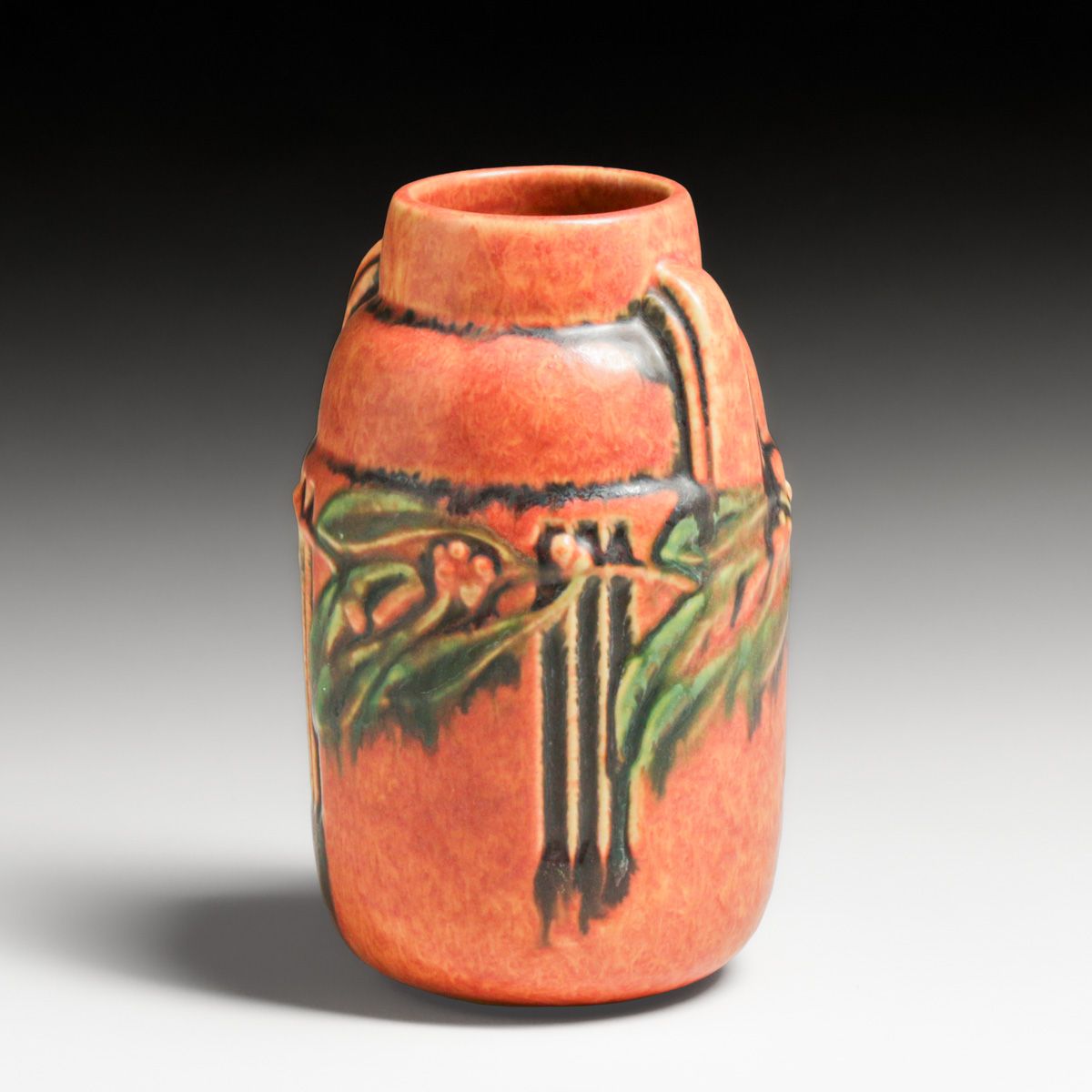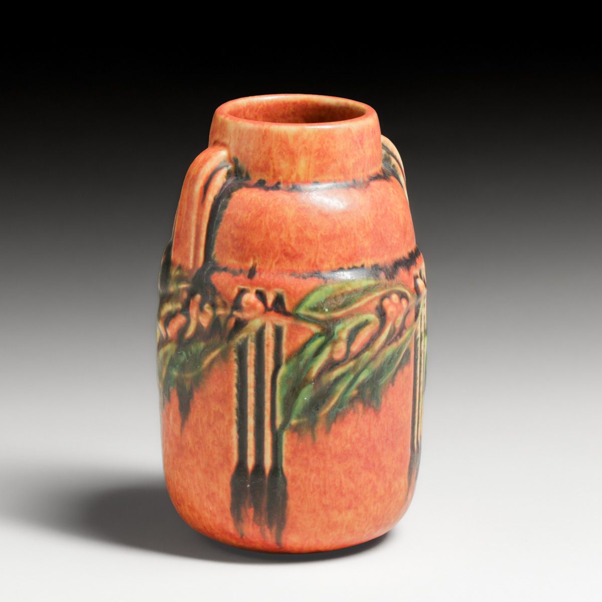 Roseville Laurel Two-Handled Vase c1930s. Unsigned. X'd, otherwise perfect condition. 7.5”h x 4”d