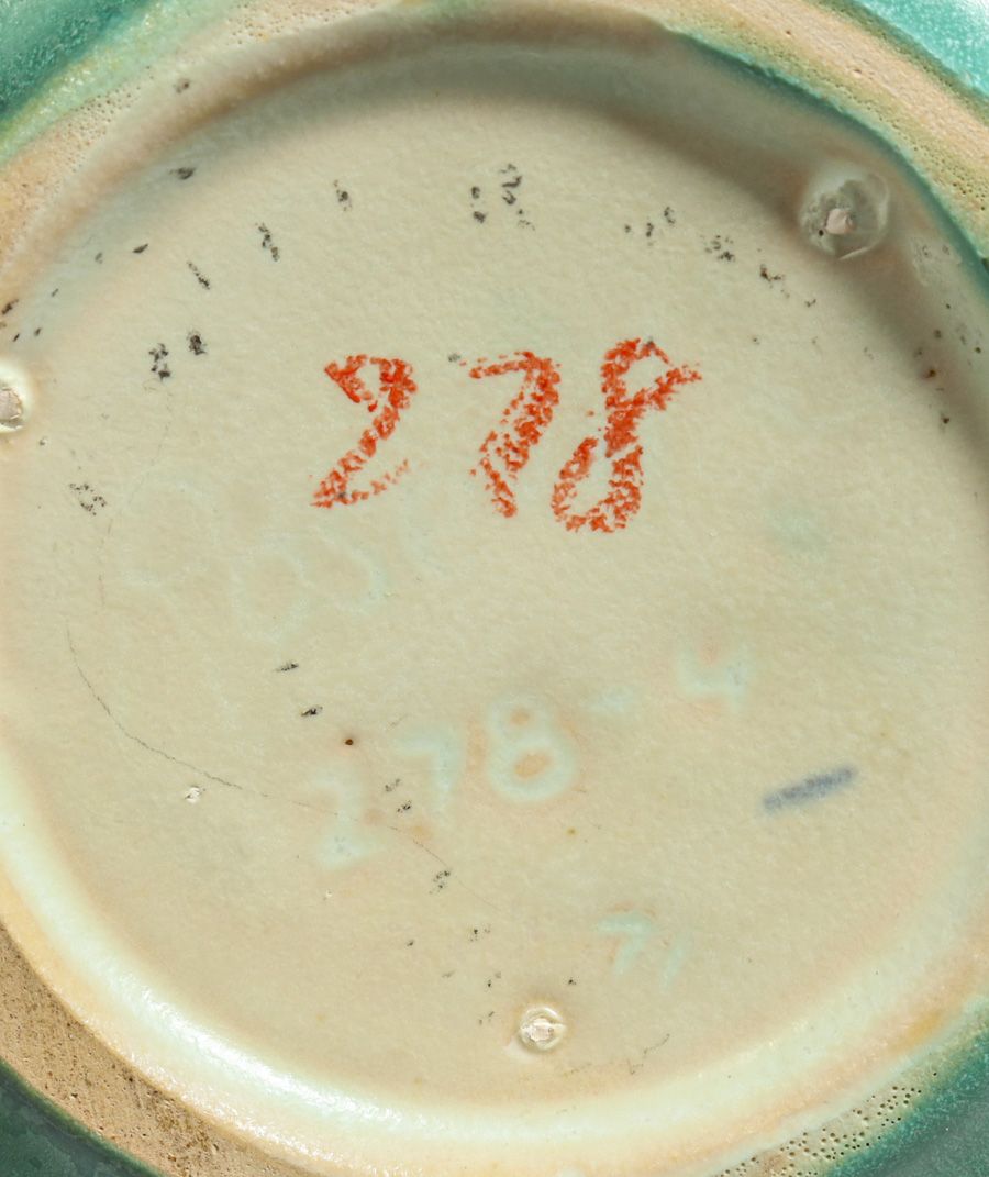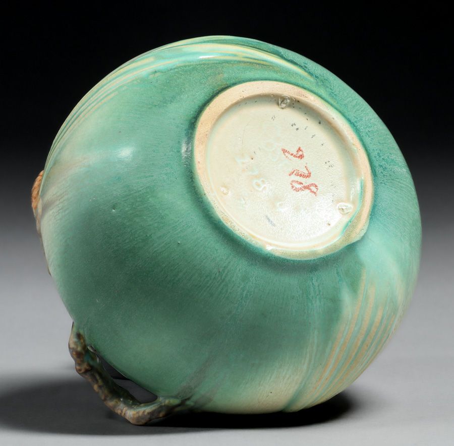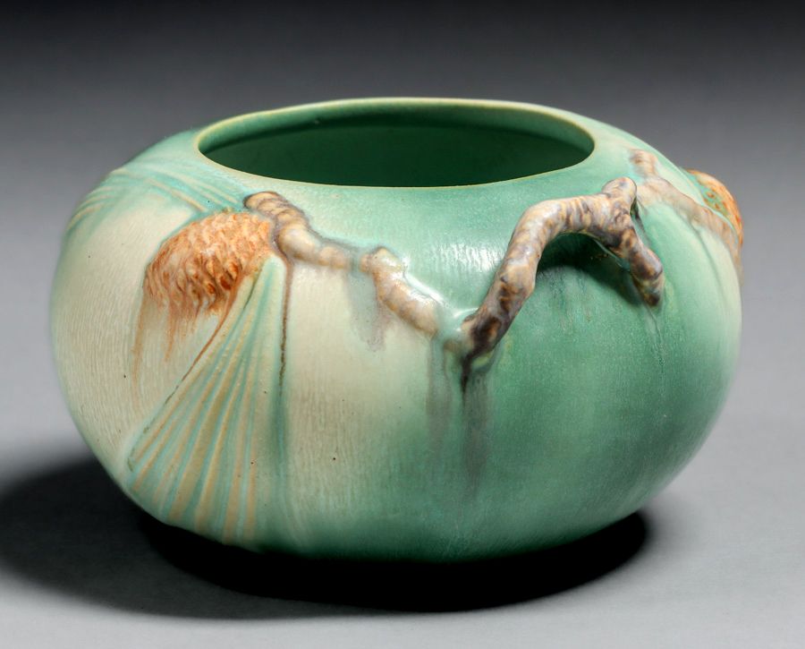 Roseville Pottery #278 Green Pinecone Vase c1930s. Marked "278" otherwise unsigned. Perfect condition. 7.5"d x 4"h SOLD