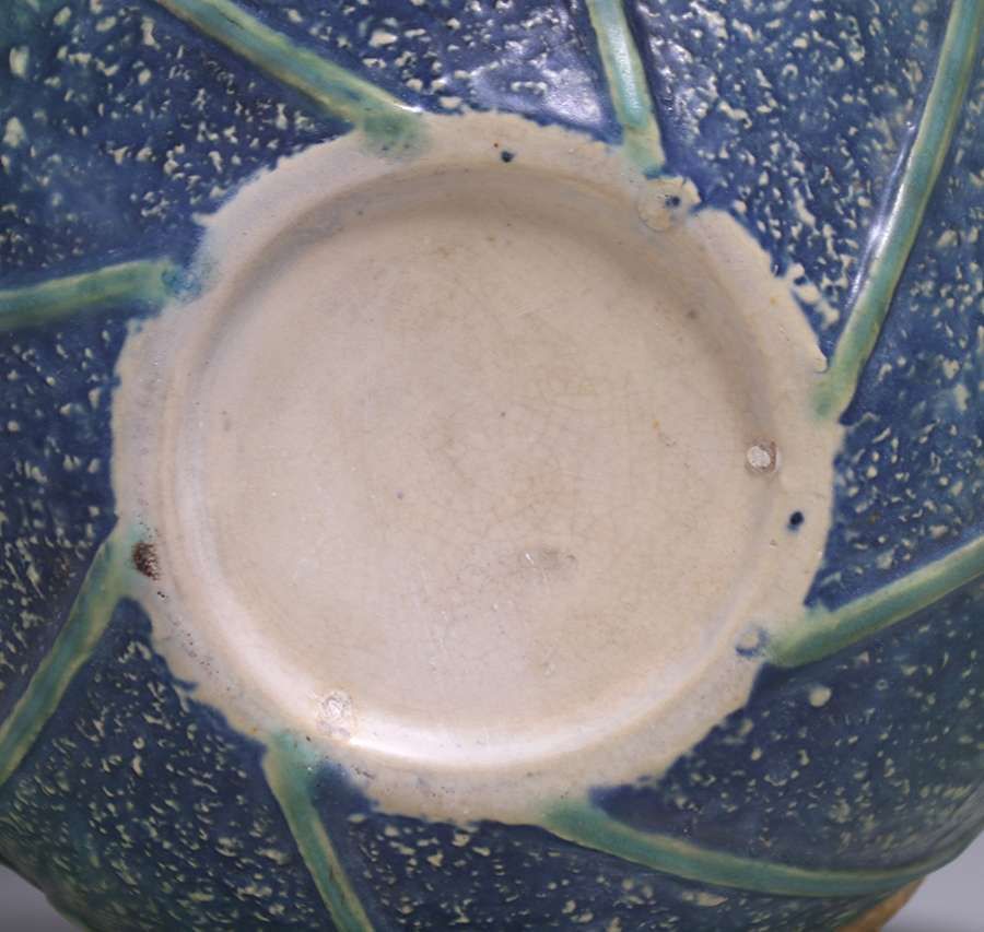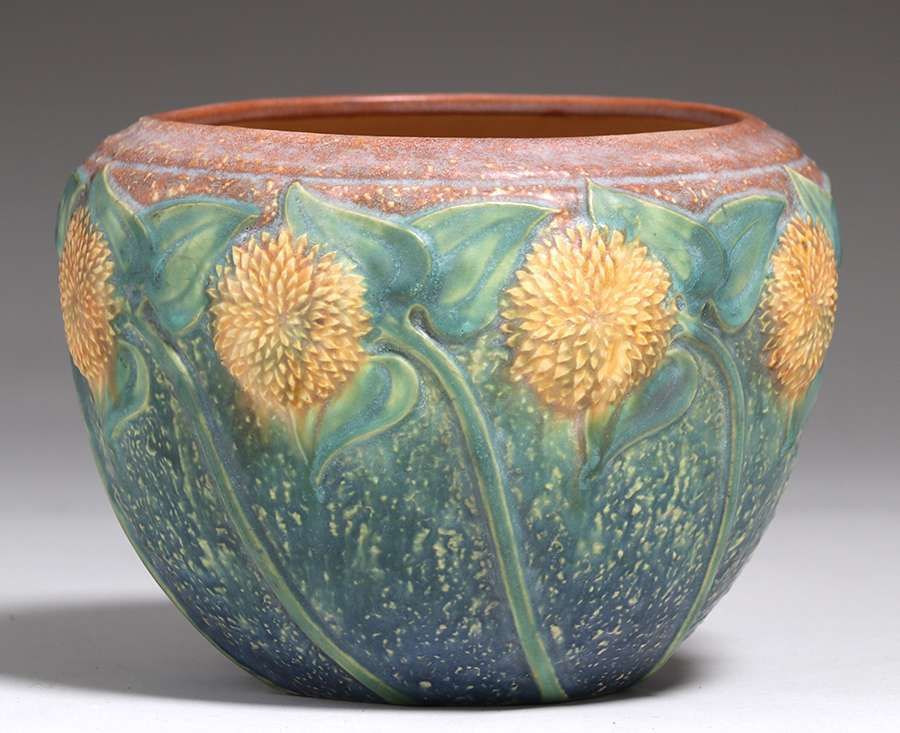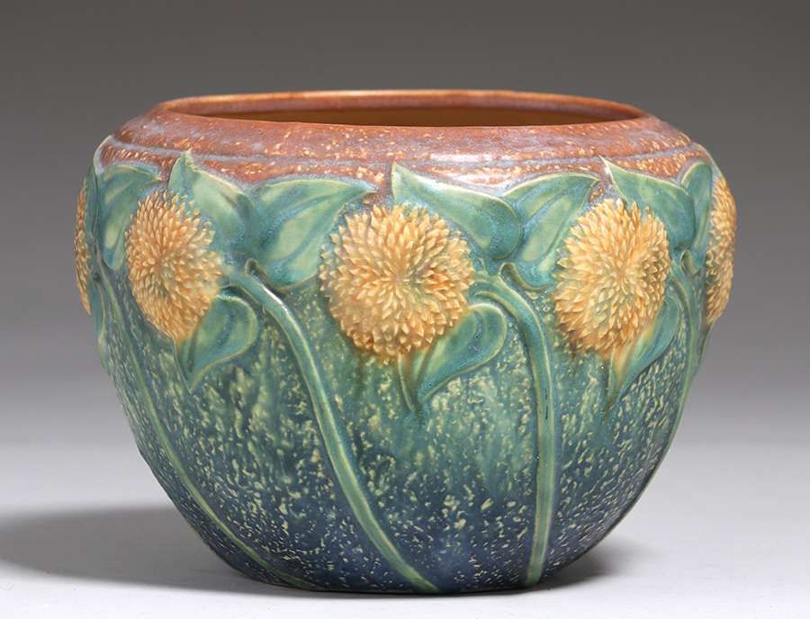 Roseville Sunflower jardiniere. Unsigned. Invisible professional restoration to small chips, otherwise perfect condition. 8.5"d x 6"h SOLD