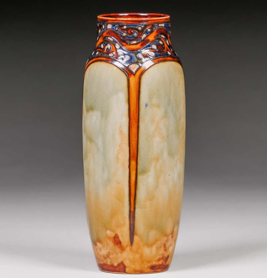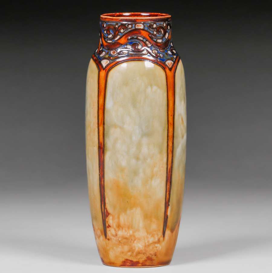 Royal Doulton Lambeth Decorated Vase c1905. Signed. Bruise to rim, otherwise perfect condition. 9"h x 3.5"d SOLD
