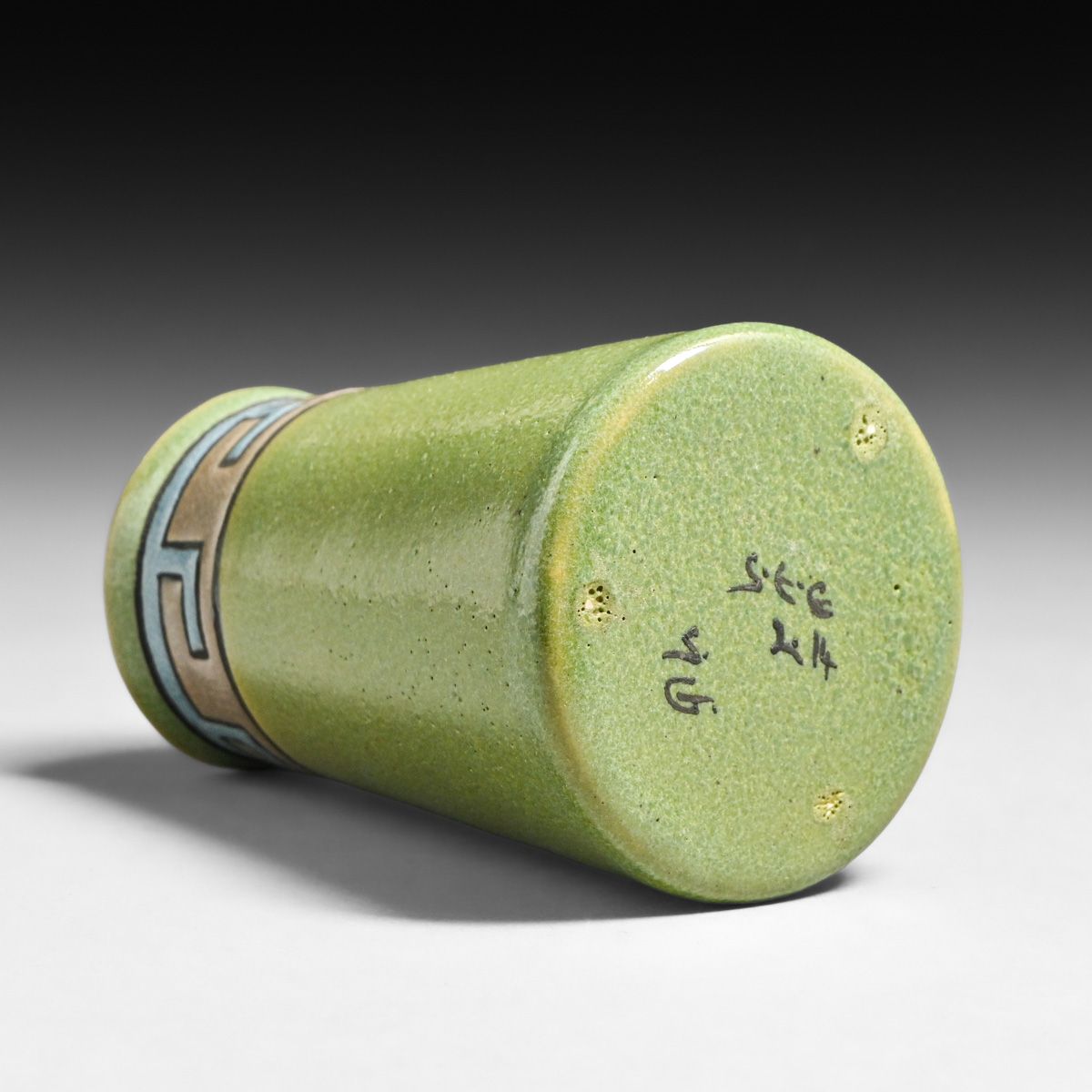 Saturday Evening Girls (SEG) Sara Gelner Carved Greek Key Vase 1914. Signed. Perfect condition. 4 1/8"h x 2.5"d