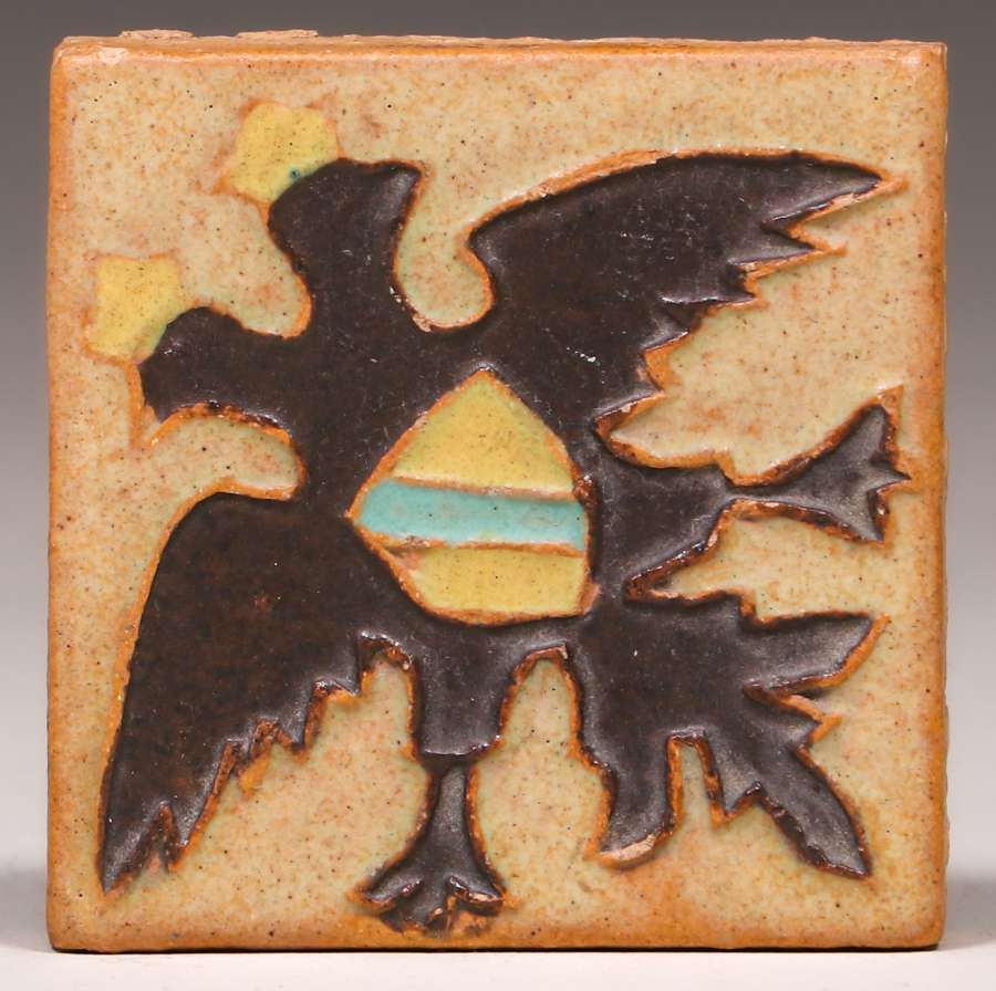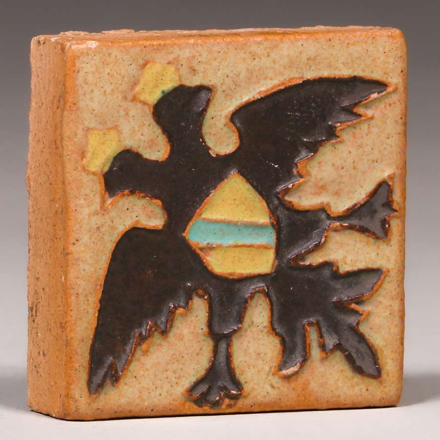 S&S Double Eagle Tile c1920s. Unsigned. Tiny edge chip, otherwise perfect condition. 2.5" x 2.5" SOLD