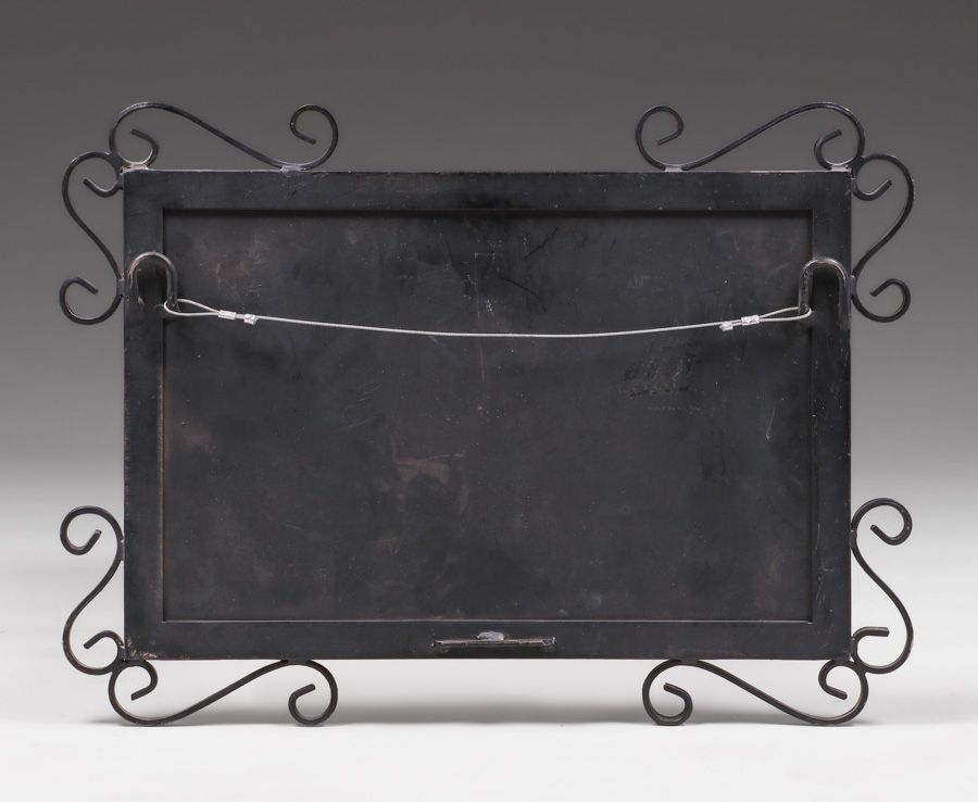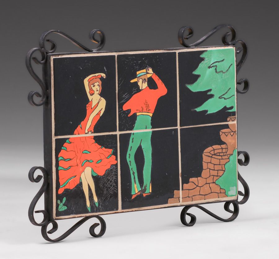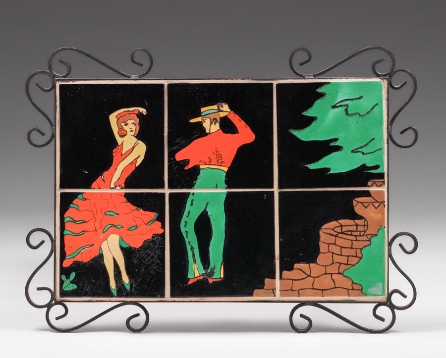Taylor Tile Co – Los Angeles Six-Tile Spanish Dancers c1930s. Unsigned. Mounted in contemporary hand-forged iron frame. Tiles 12”h x 18”w. Iron frame 16.25”h x 22”w