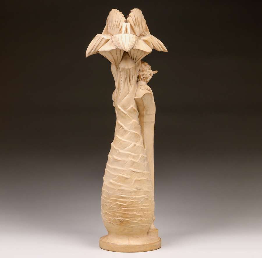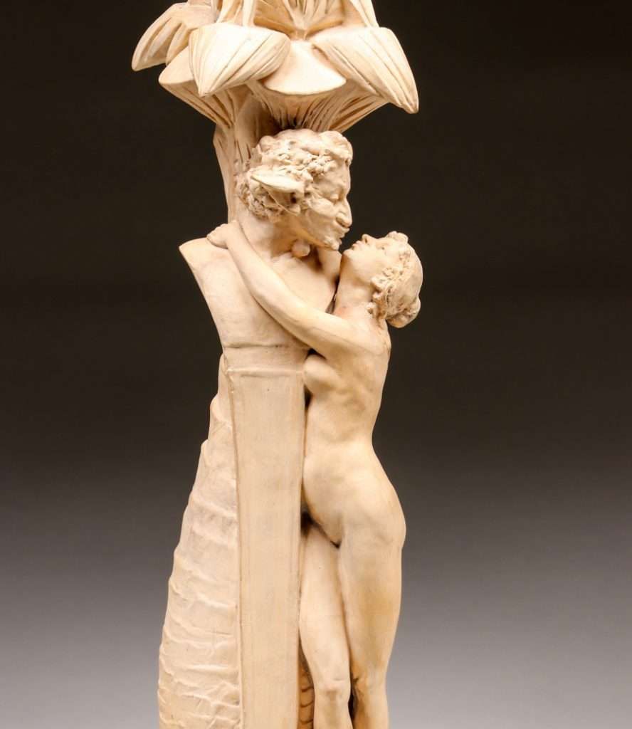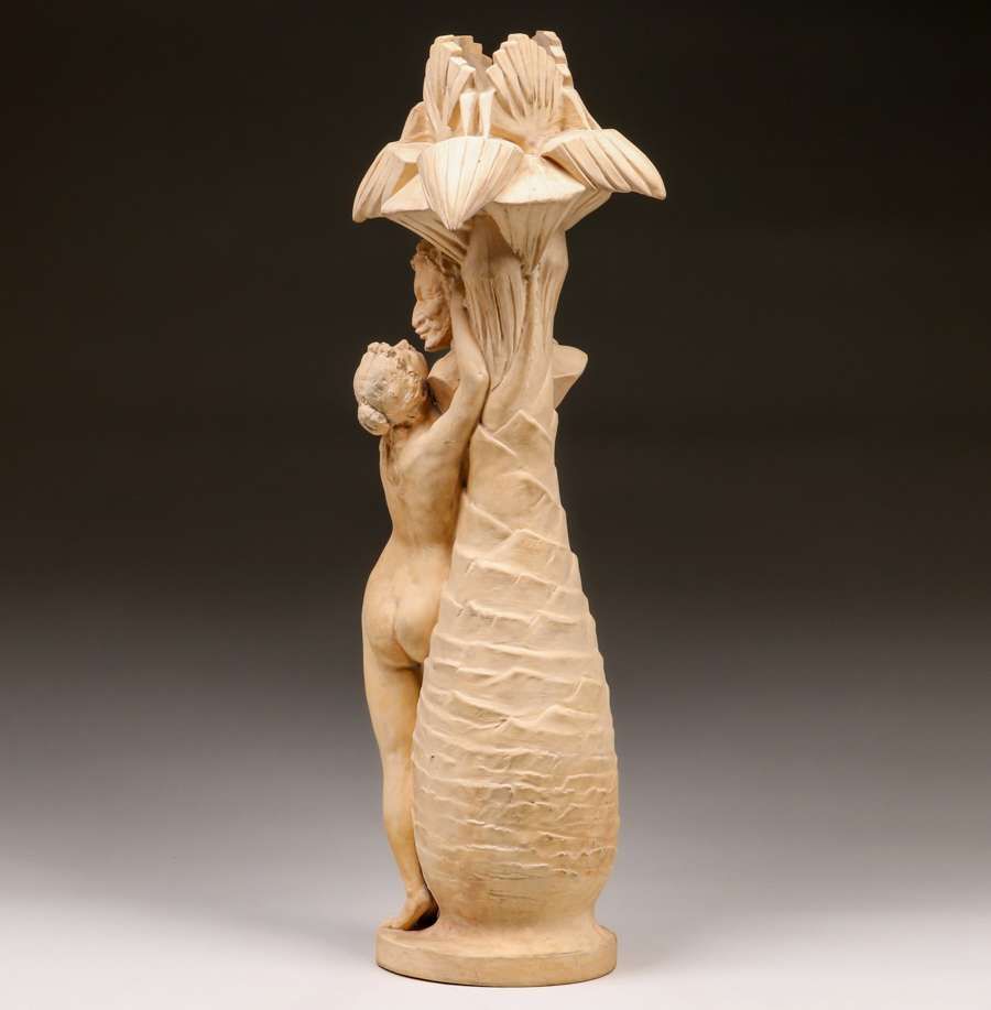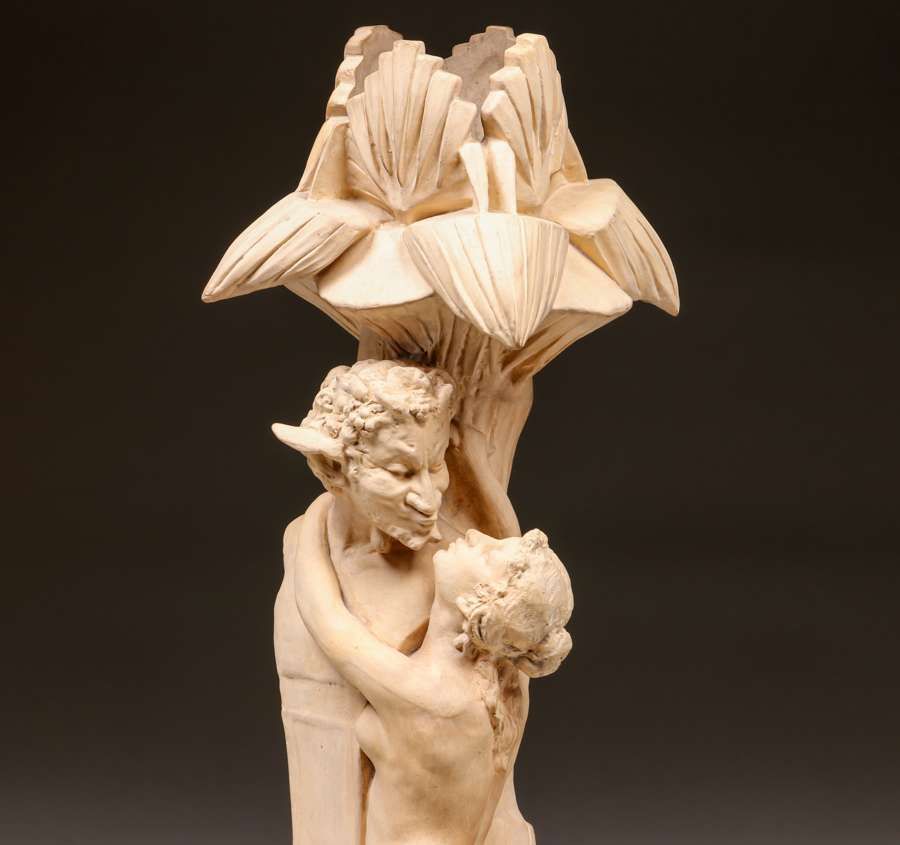 Large Teco Pottery Bisque Vase Satyr & Nymph c1905. Signed. Invisible professional restoration to small base chip, otherwise perfect condition. 25"h x 7"d SOLD
